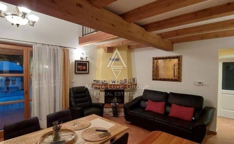 The beautifully landscaped and fenced green garden includes a sunbathing area, an outdoor shower, a 32 m² swimming pool, a tavern for social gatherings, and an outdoor fireplace.