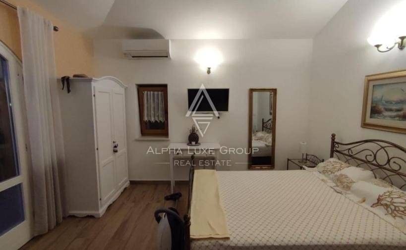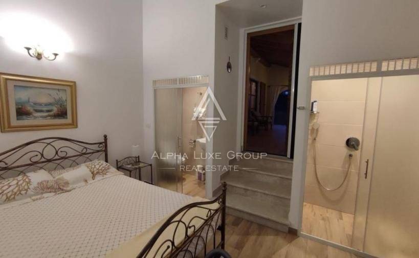 The beautifully landscaped gardens are adorned with olive trees, and the ground floor offers stunning views of greenery and the sea.