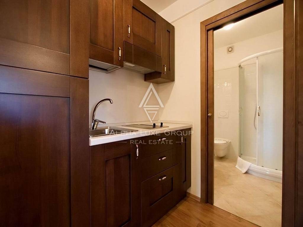 The building's back, divided into separate left and right sections, contains staff space, a cloakroom, a washing area, and another toilet that is all unseen from view. There are four bedrooms on the left side, each with its bathroom, a separate one-room apartment with 1SS, kitchen, living room, and terrace overlooking the surroundings.