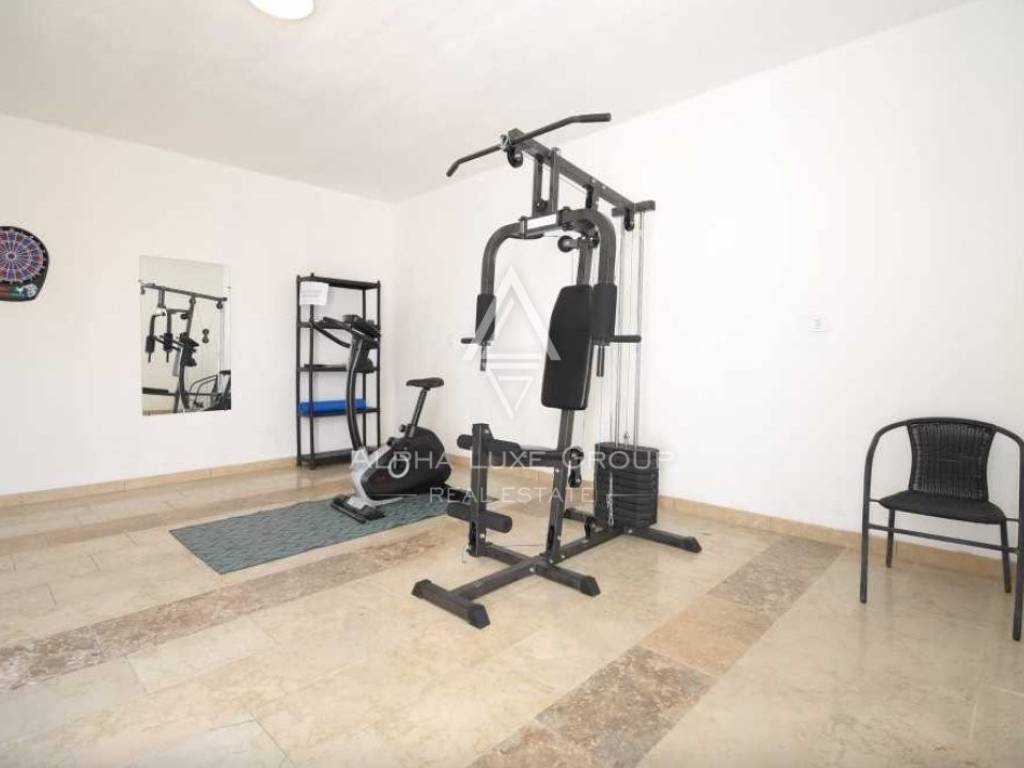 Spanning 230 square meters of living space across two fully air-conditioned levels, the villa's ground floor reveals a well-appointed kitchen with terrace access, alongside a combined dining and living area. This level also houses a bedroom with an en-suite bathroom and a communal lavatory. The upper floor features three bedrooms, each offering en-suite facilities and balcony access with picturesque views of the lush surroundings and pool. An adaptable empty room presents extra storage possibilities, while a fitness room enriches the basement.
