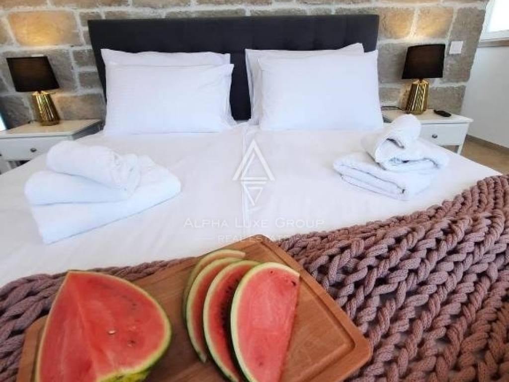 The upper floor reveals two additional bedrooms, each boasting terraces that invite you to bask in the sunlight with a refreshing drink or your morning coffee. The bedrooms are accompanied by private bathrooms, ensuring privacy and comfort for all guests.