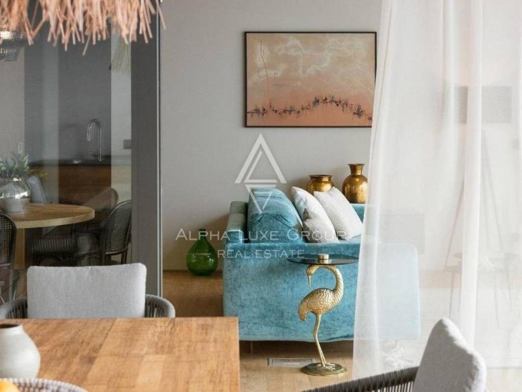 The villa is thoughtfully divided into private sleeping quarters and a lively communal area. The living area consists of a spacious living room, dining area, and a modern, well-equipped kitchen. This open space is bathed in sunlight streaming through large glass walls, offering views over the meticulously maintained garden with its swimming pool. The living room opens onto a large covered terrace of 50.17 m2, complete with a sitting area, dining table, and a fully equipped summer kitchen, perfect for entertaining.