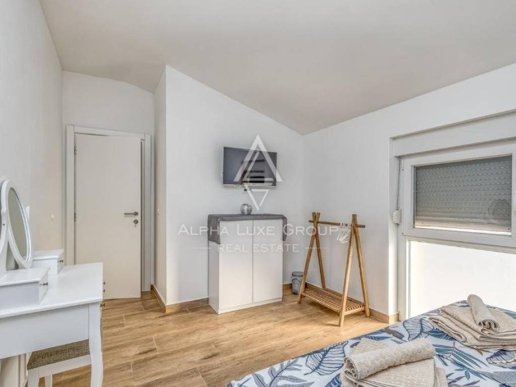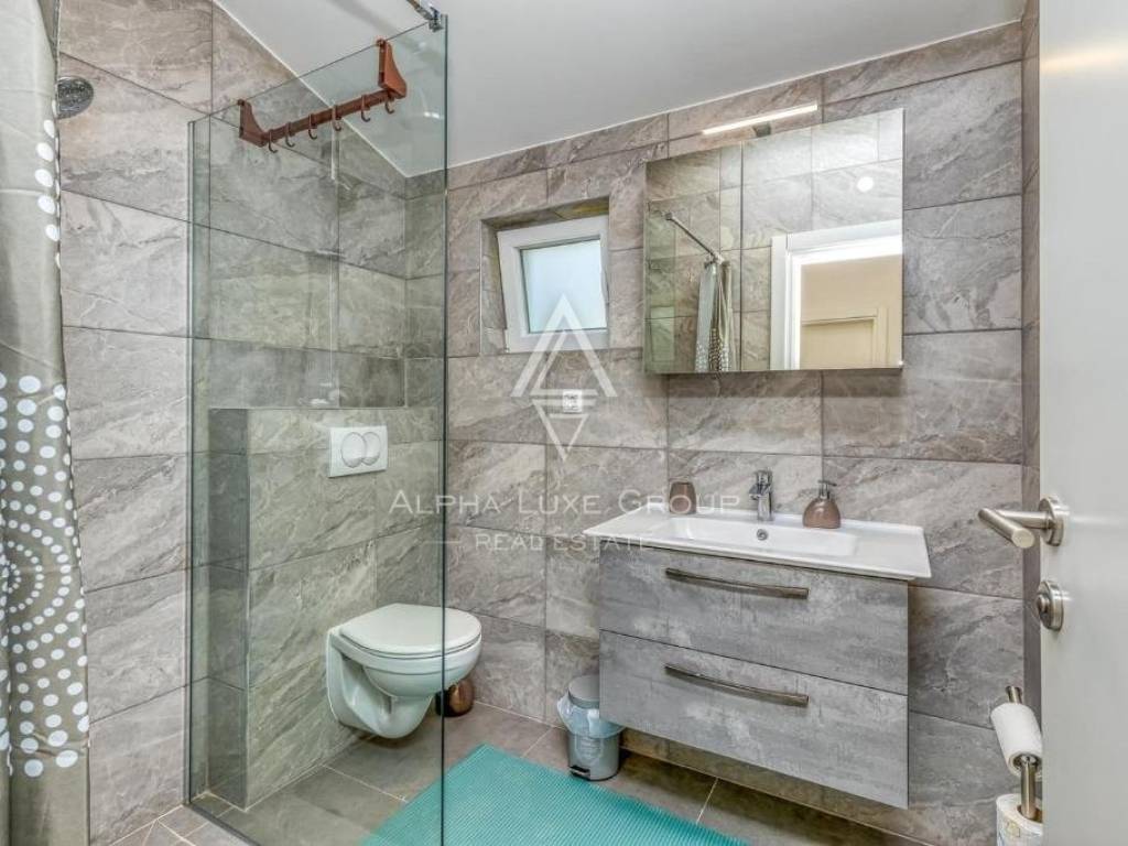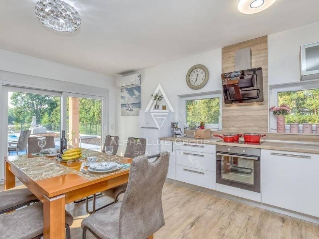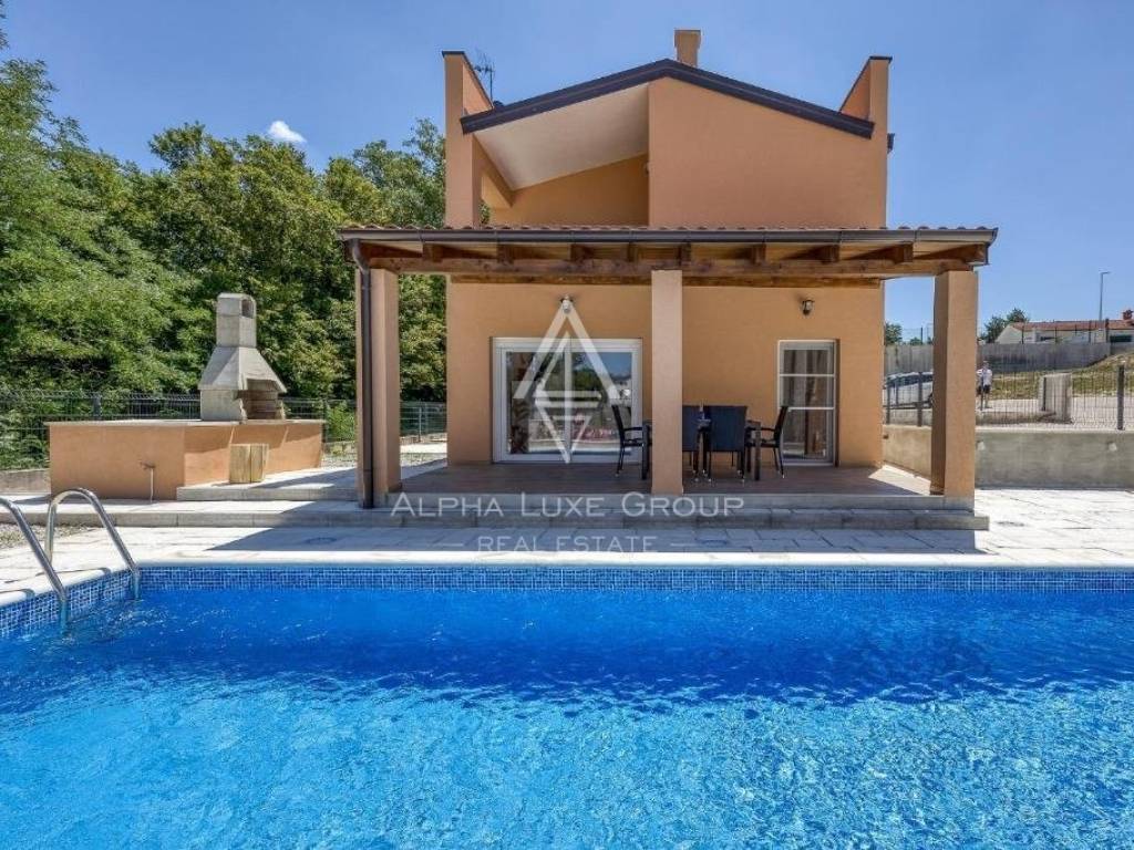 Offered for sale is a recently constructed semi-detached house in the serene area near Tinjan, completed in 2022. Spanning 84 m² across two levels, this home is accompanied by a 268 m² garden and includes two parking spots. The ground floor unveils a generous living area blending seamlessly with an open-plan kitchen and dining space, alongside a bathroom and storage room. Direct access from the living area leads to an inviting terrace and pool area. The first floor hosts two bedrooms, an additional bathroom, and a laundry room. Climate control is efficiently managed with air conditioning units, while the infrastructure for pellet central heating is already in place. Enhanced thermal insulation ensures minimal need for cooling during summer months.