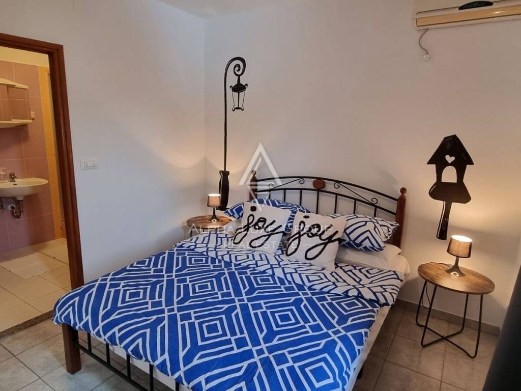 The ground floor hosts a 112 m² air-conditioned apartment with a kitchen, dining area, living room, three bedrooms, two bathrooms, and a semi-covered terrace. This unit is currently rented and accommodates up to eight guests.