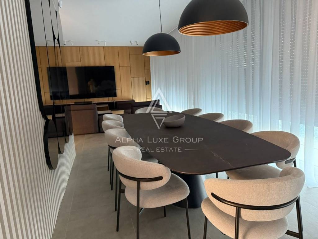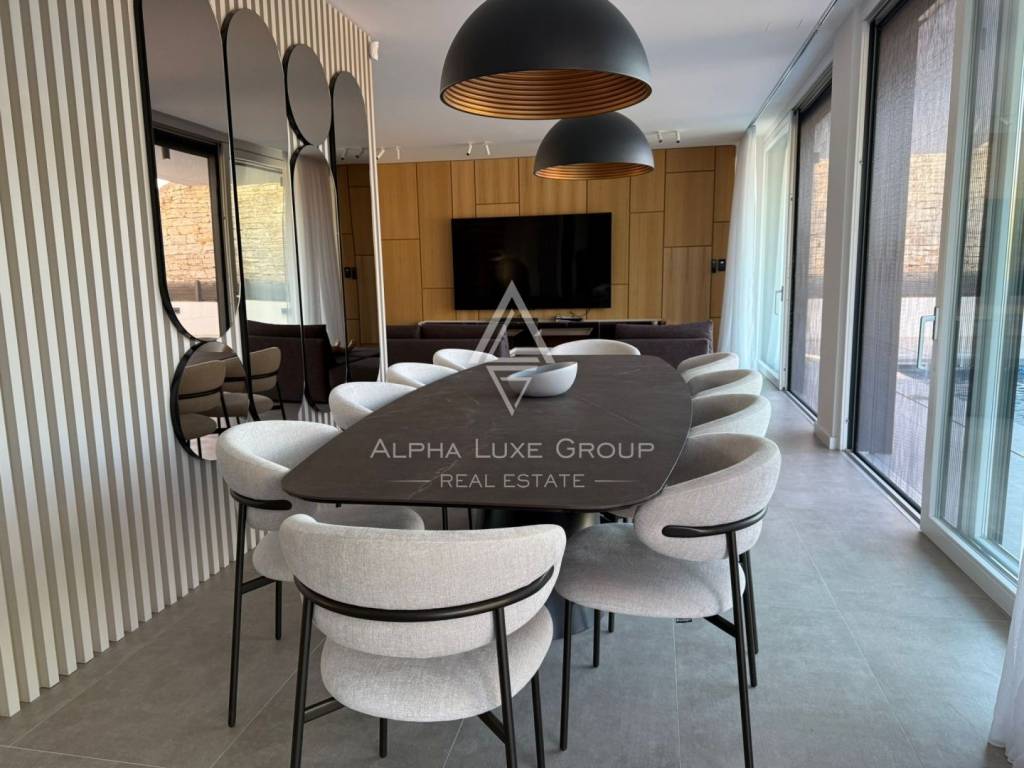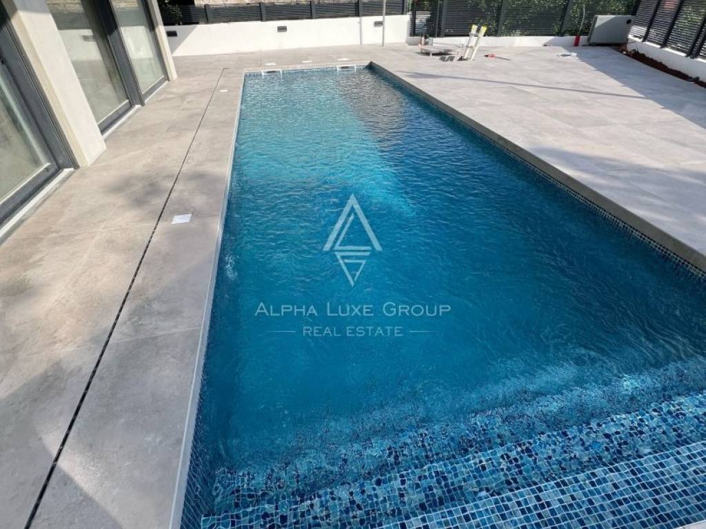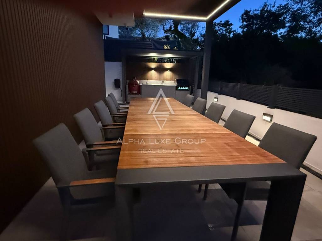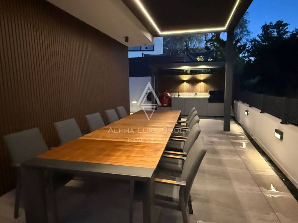 The ground floor showcases a bright open-plan living space with a spacious dining area and a modern kitchen accented by glass elements, elegant lighting, and a custom-made island fitted with premium Miele appliances. This level also includes a guest toilet, storage, and a utility room equipped with a heat pump, washing machine, dryer, video surveillance, and alarm system. Large sliding glass doors open seamlessly onto the sundeck, lounge area, and the 30 m² swimming pool finished with glass mosaic and automatic water maintenance.