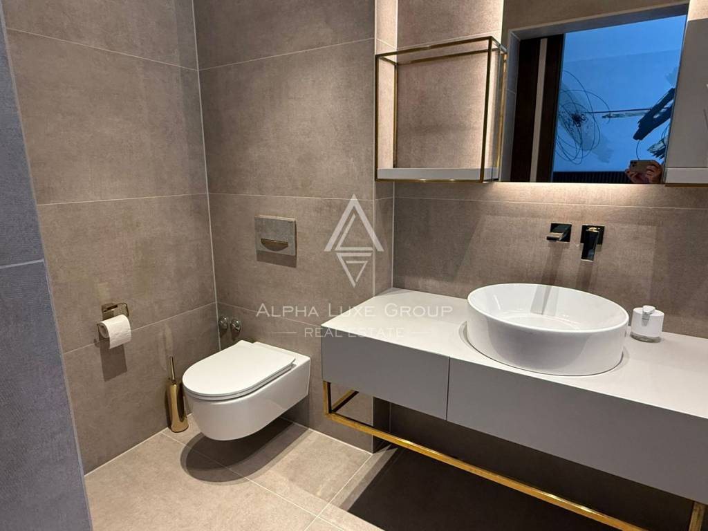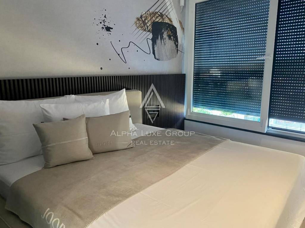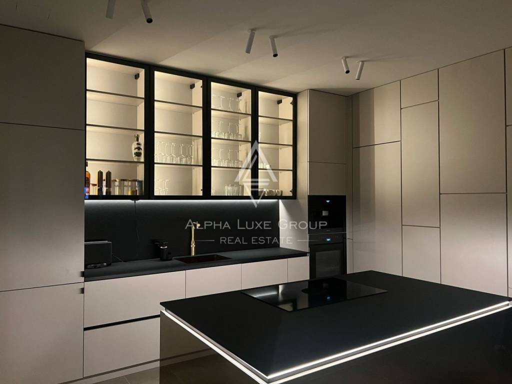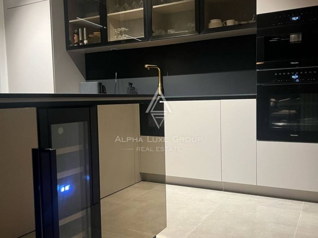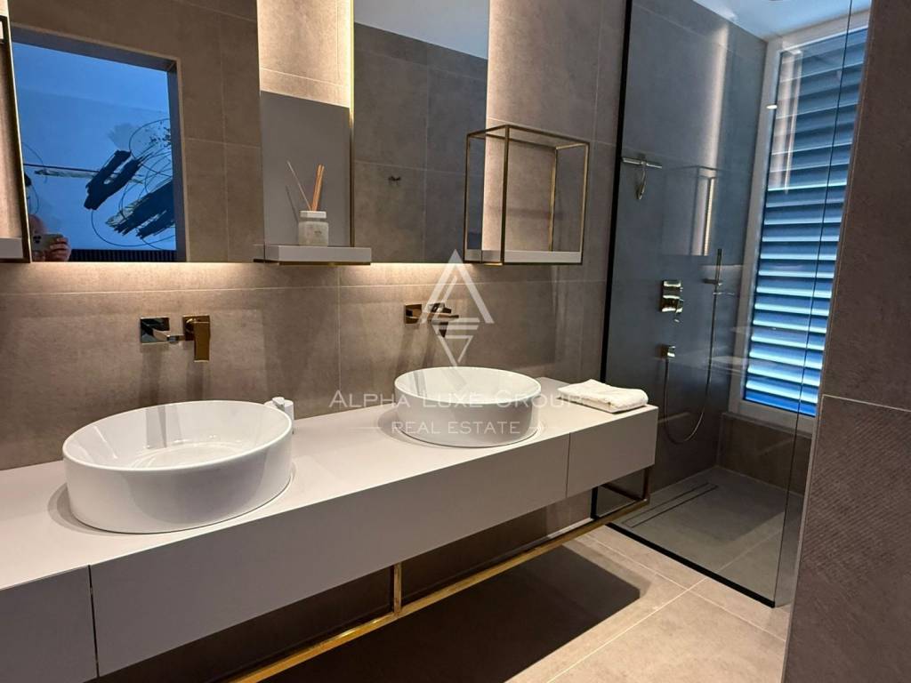 The ground floor showcases a bright open-plan living space with a spacious dining area and a modern kitchen accented by glass elements, elegant lighting, and a custom-made island fitted with premium Miele appliances. This level also includes a guest toilet, storage, and a utility room equipped with a heat pump, washing machine, dryer, video surveillance, and alarm system. Large sliding glass doors open seamlessly onto the sundeck, lounge area, and the 30 m² swimming pool finished with glass mosaic and automatic water maintenance.
