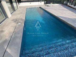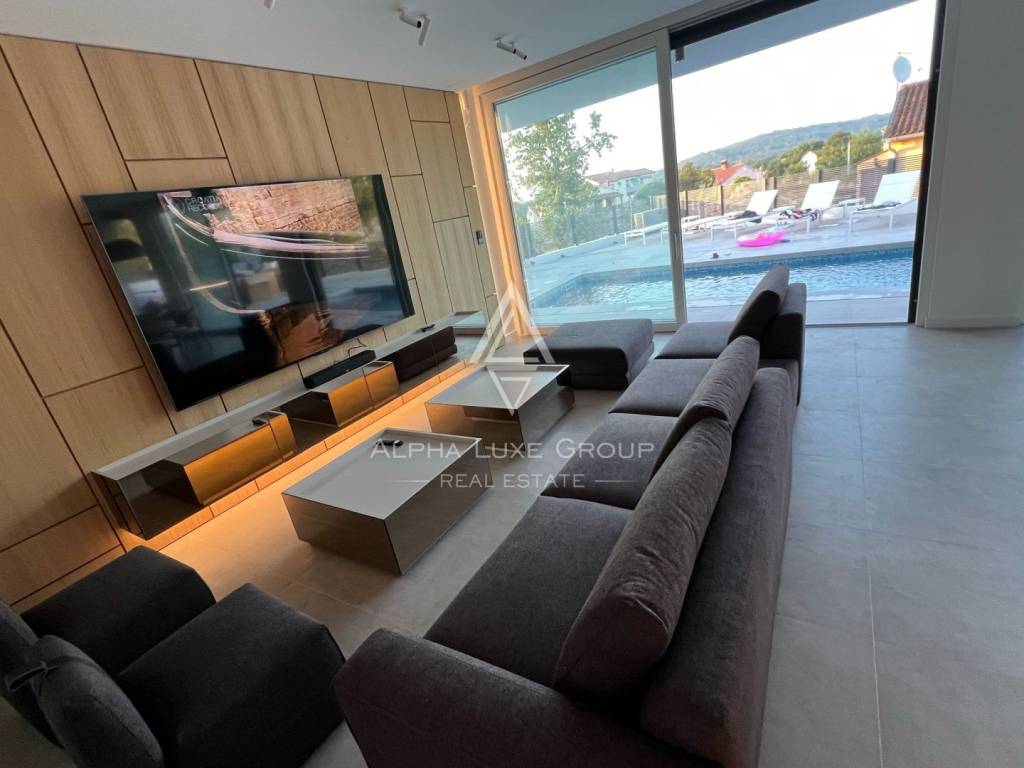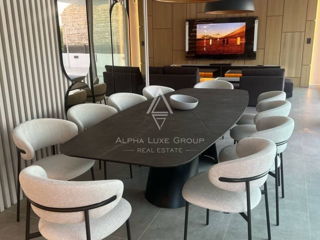 The villa is elegantly furnished with Italian Caligaris furniture and offers underfloor heating via a heat pump, air conditioning, and a smart home system with digital LCD displays in each room to manage lighting, blinds, curtains, heating, and cooling. A central LCD panel on the ground floor allows full control of the property, also accessible via mobile devices.