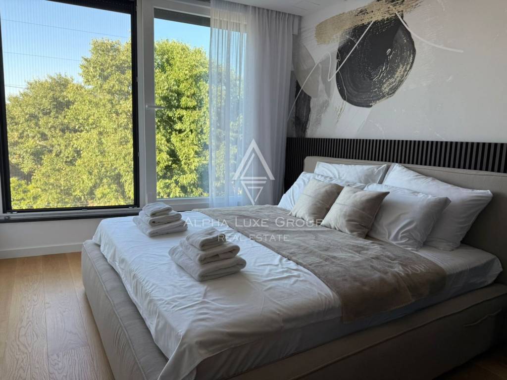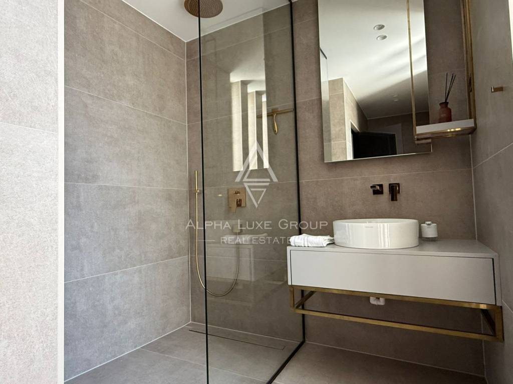 On the upper floor, there are four generously sized bedrooms, each with its own luxurious bathroom. Two bathrooms feature sleek black glass doors, while the others have designer sliding wooden doors harmonizing with built-in wardrobes and sophisticated wall coverings. All bedrooms are equipped with modern double beds, televisions, designer wallpaper, and custom-made storage.