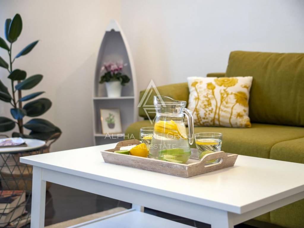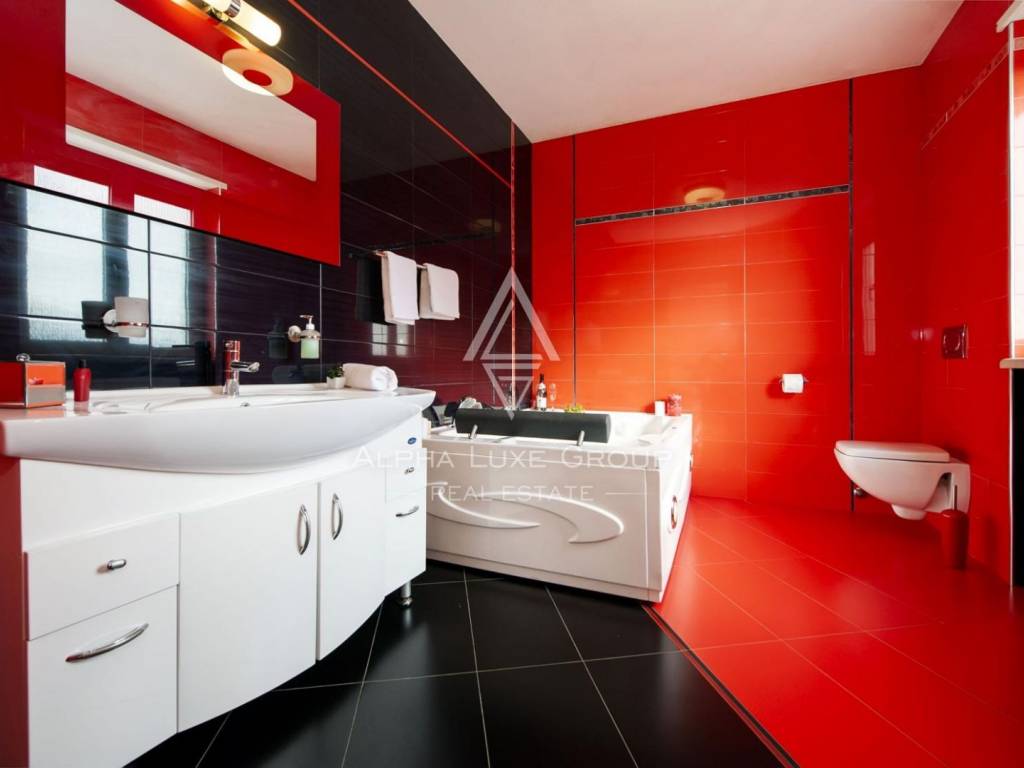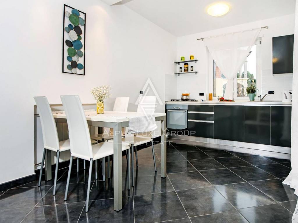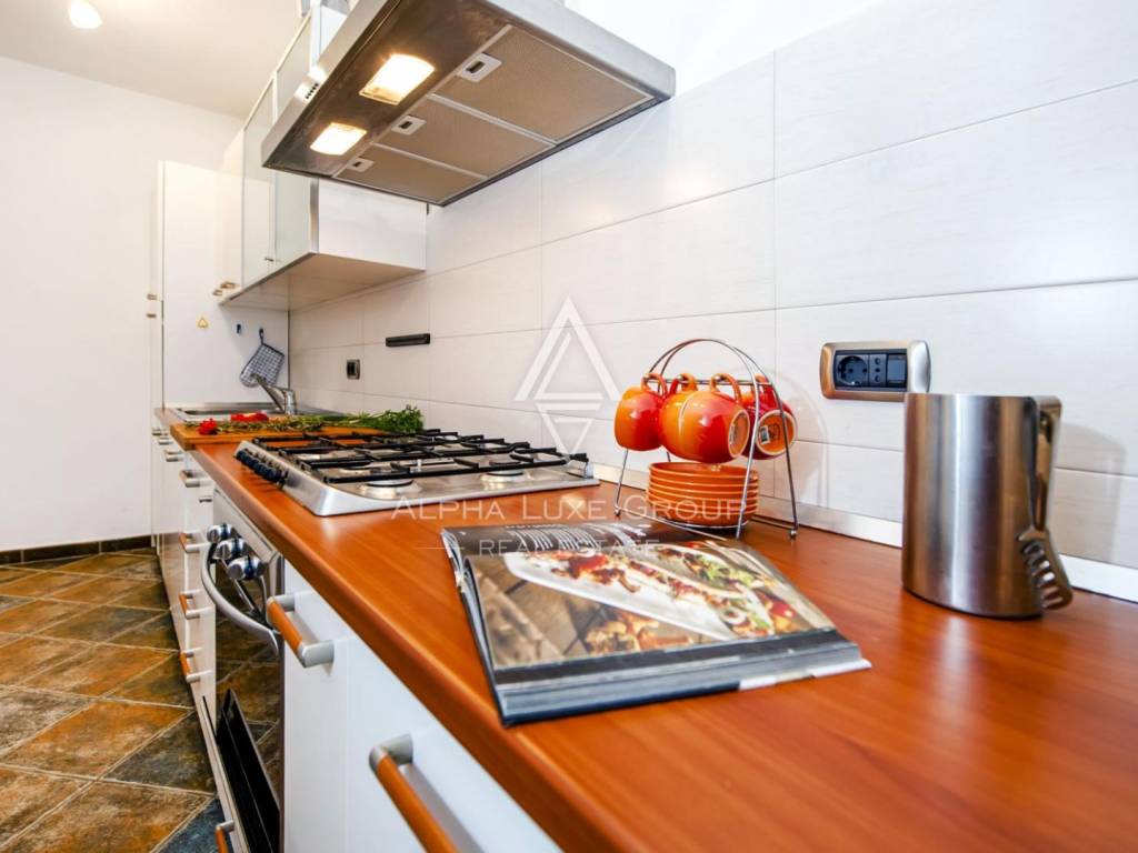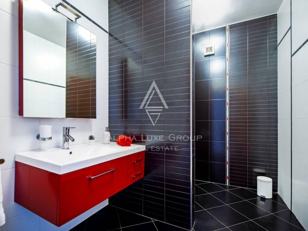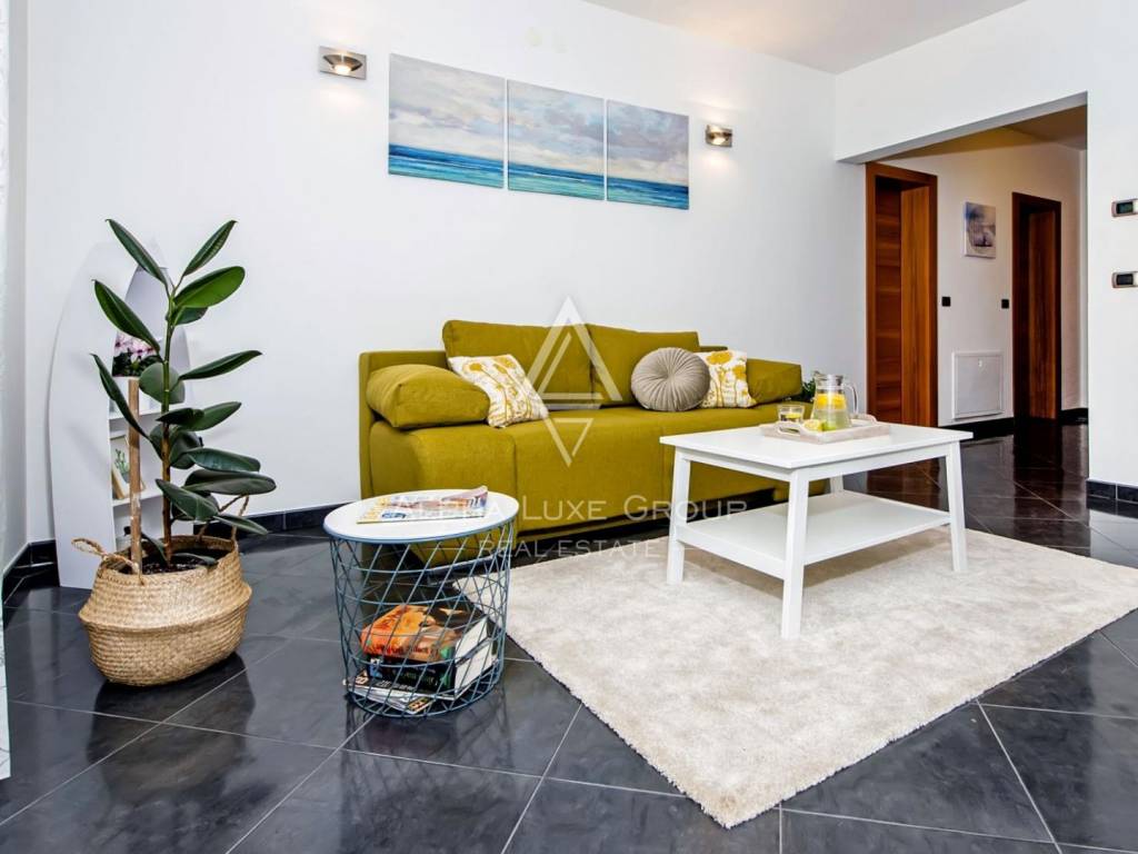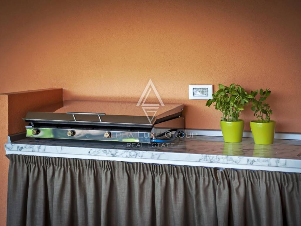 The upper floor offers a beautifully arranged residential unit with three luxury bedrooms, two modern bathrooms, a fully equipped kitchen and a generous living room. A large balcony overlooks the surrounding greenery, creating the perfect ambiance for relaxing summer evenings.