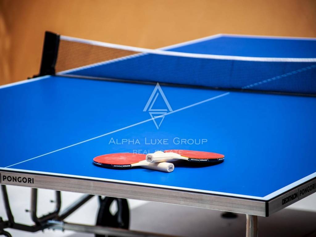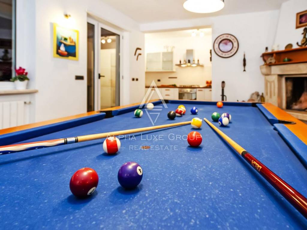 A cosy indoor fireplace enhances the shared lounge area, making it ideal for year-round use. This space is complemented by billiards, table tennis and a relaxing atmosphere perfect for gatherings in the cooler months. The villa is equipped with central gas heating, while air conditioning ensures comfort throughout the warmer season.
