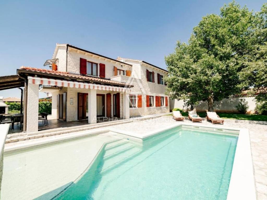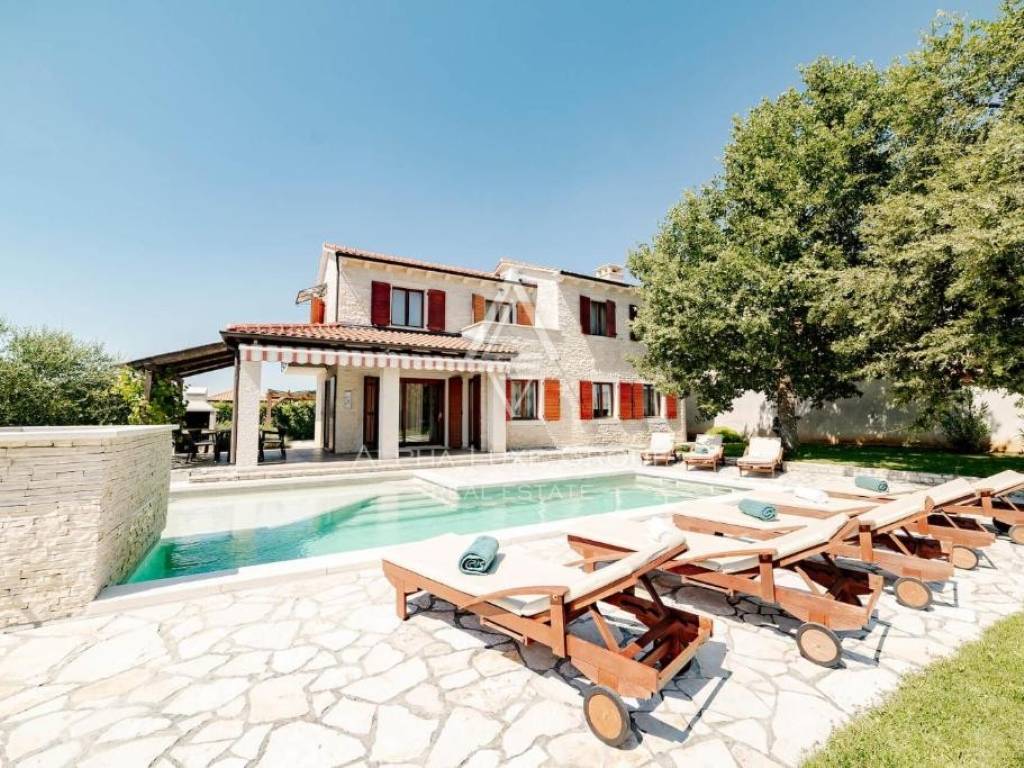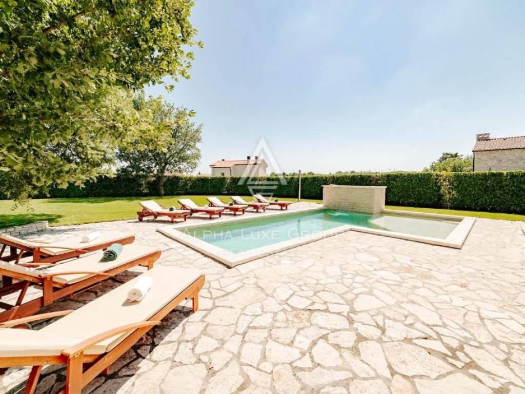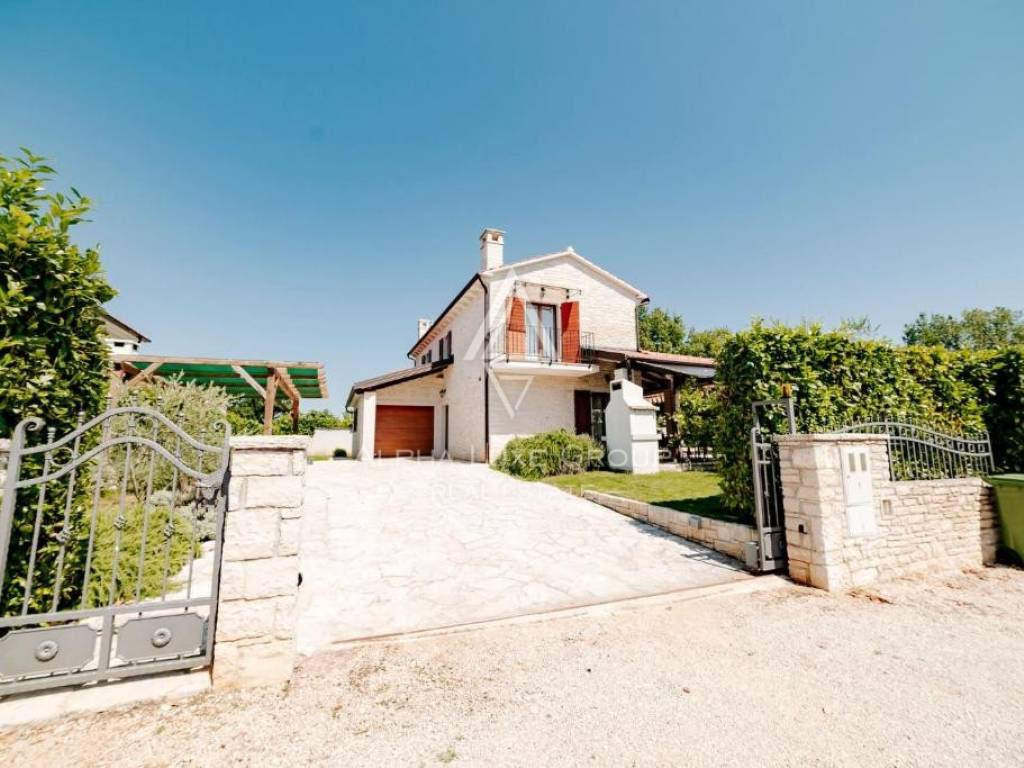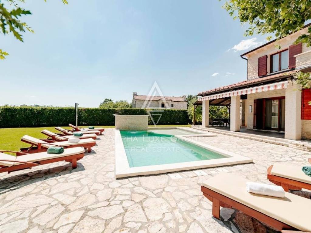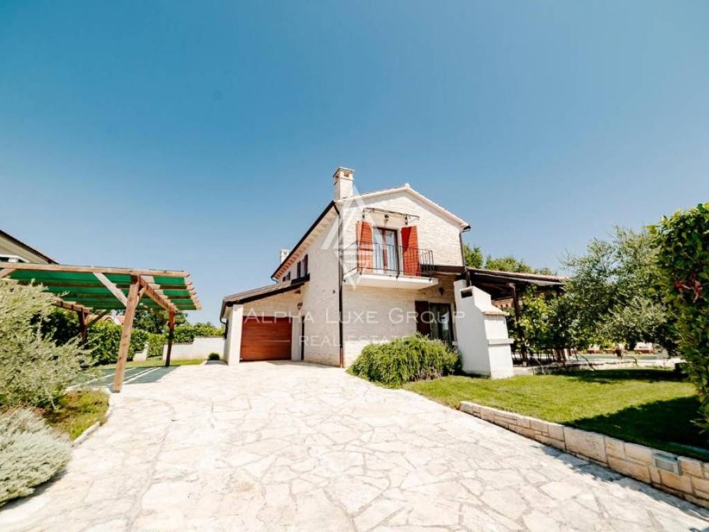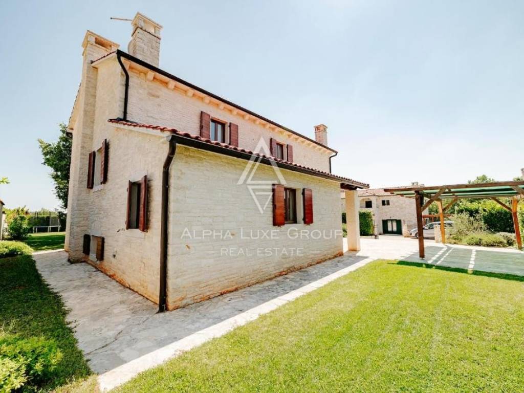 Located in a peaceful green setting near Višnjan, this charming rustic home combines traditional character with modern comfort and quality craftsmanship. The stone clad exterior blends naturally with the surrounding landscape, while the interior is arranged across three functional levels tailored for comfortable everyday living.