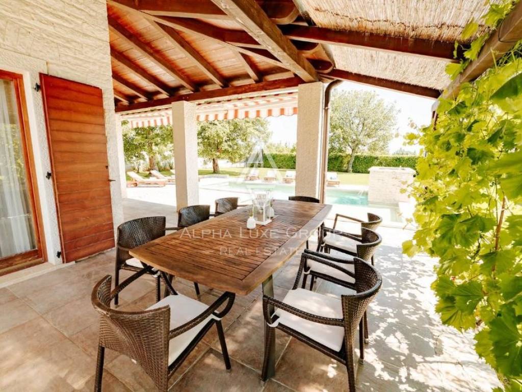 The landscaped and fully fenced garden ensures privacy and includes a swimming pool with a sunbathing area, perfect for enjoying the warm Istrian climate. The overall layout of the home, combined with its thoughtfully designed outdoor spaces, creates a harmonious environment suitable for both year round living and holiday use.