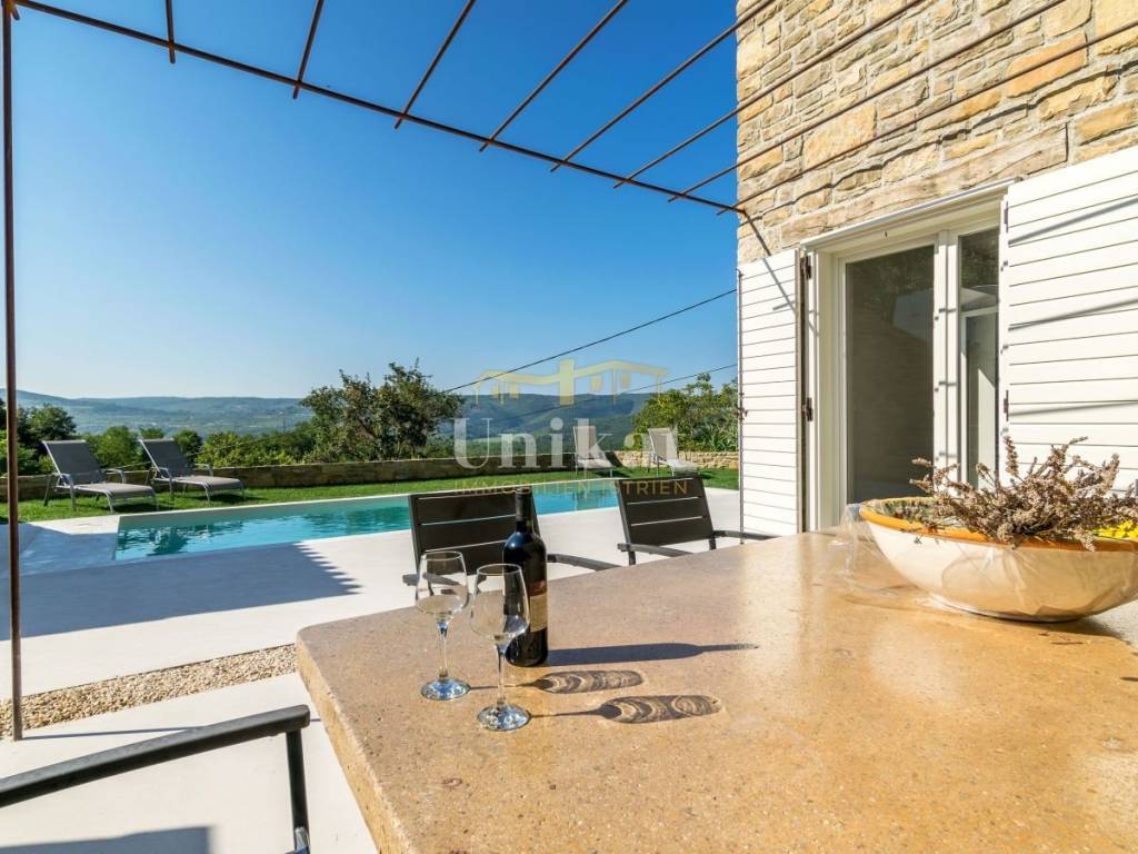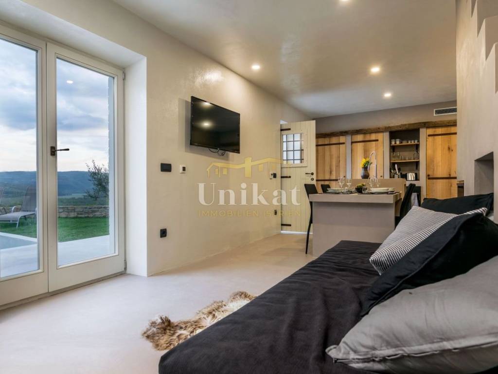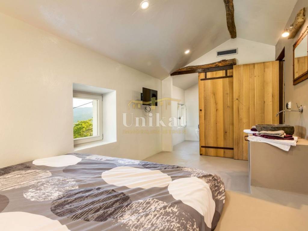 Stone house in Central Istria with a view of nature, demolished and rebuilt from the foundation in 2016. On the ground floor, the house consists of a living area with kitchen and dining space, a toilet, and a sauna. On the upper floor, there are two bedrooms and two bathrooms.