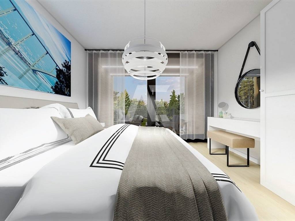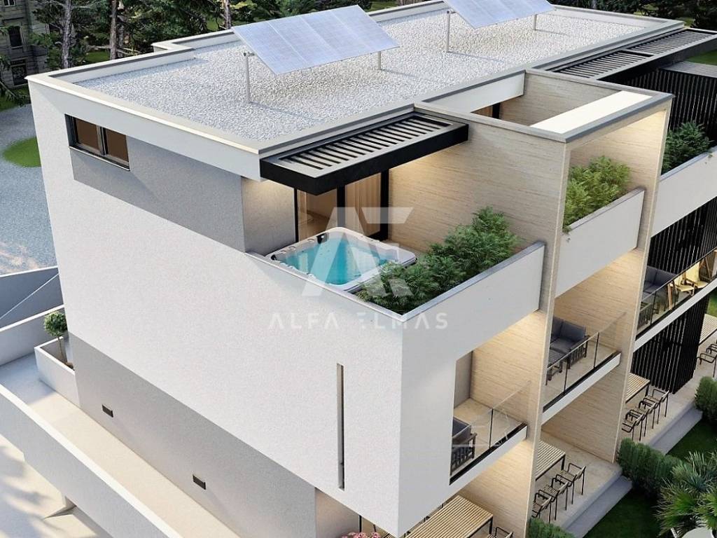 Krk, luxurious three-story apartment in a modern avant-garde villa. Top Location!! The apartment extends to 87.20 m2, has an excellent layout of rooms, southwest orientation. On the ground floor there is a hallway, kitchen, living room, dining room, terrace with access to the garden, toilet and stairs leading to the first floor. On the first floor there are two bedrooms, a balcony, a bathroom and a staircase that leads to the second floor. On the second floor there is a gallery also with a bathroom and a terrace. This terrace is equipped with a jacuzzi. The apartment will be equipped with top-quality equipment such as PVC carpentry with aluminum shutters, underfloor heating, air conditioning and smart home systems. Completion of construction and occupancy is expected by December 2023. In the basement of the apartment there is one parking space in the garage and one parking space in the landscaped garden. Excellent location, only 300m from the center of the beach and related facilities. Documentation in order!!