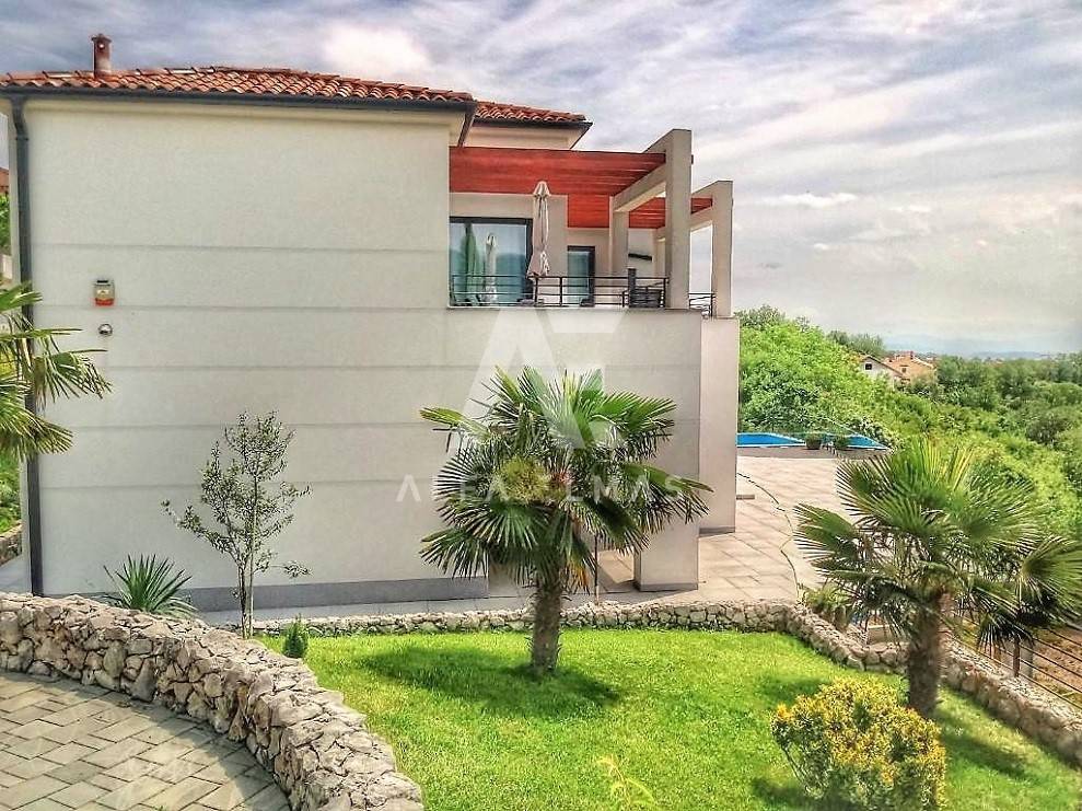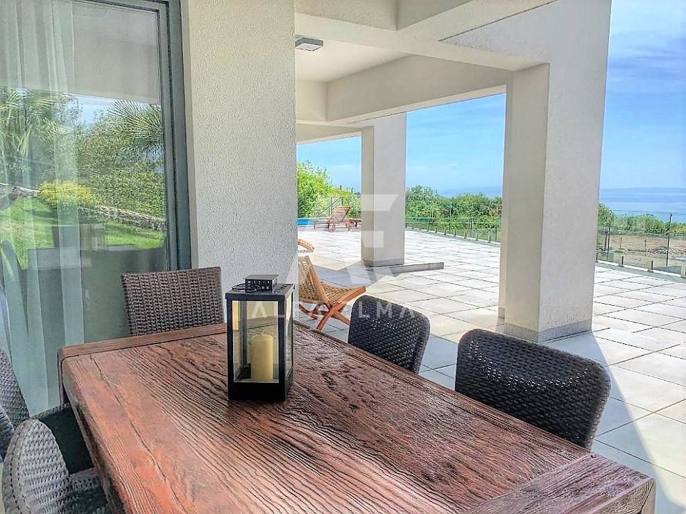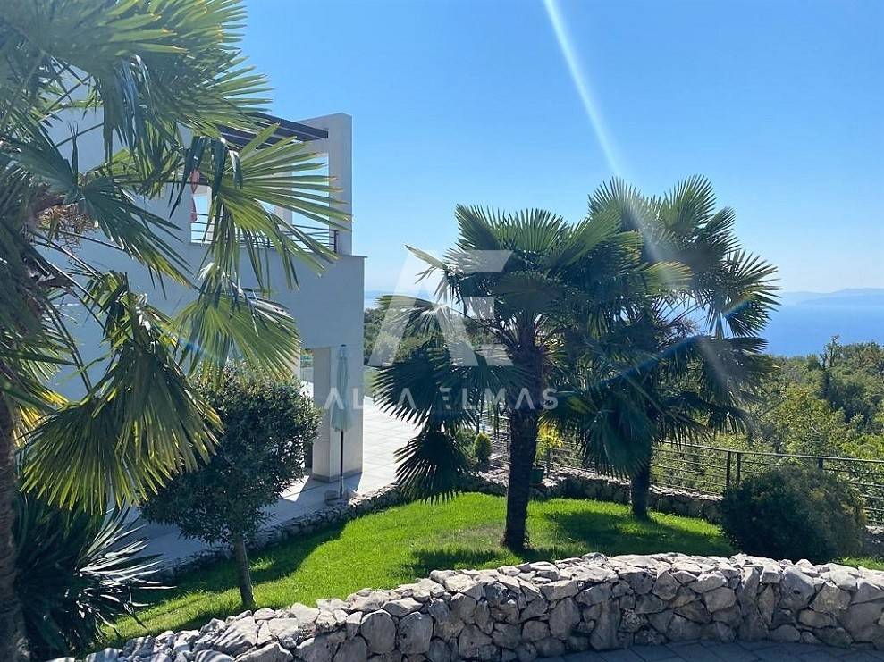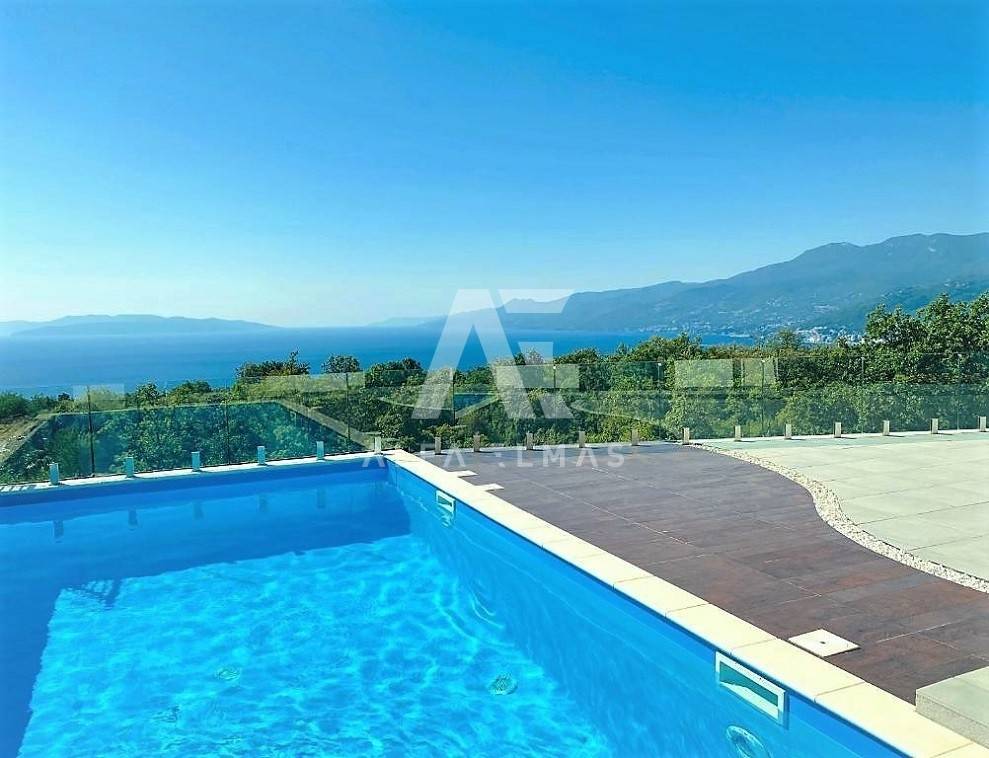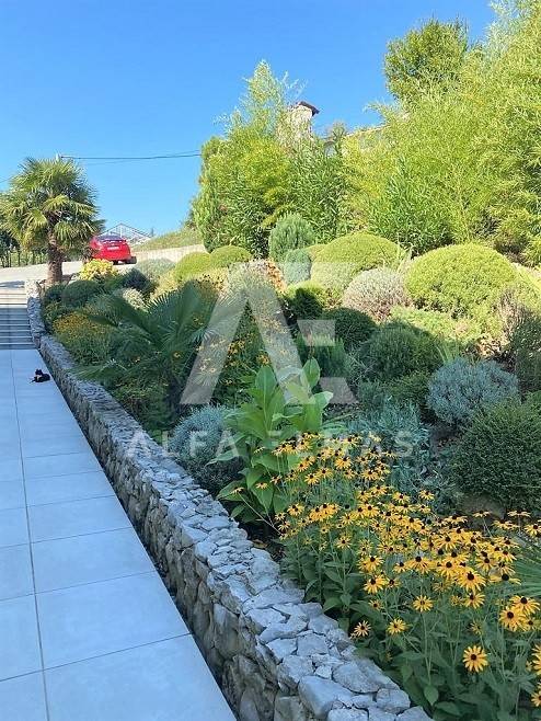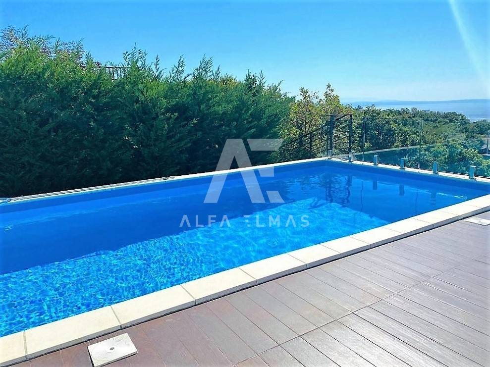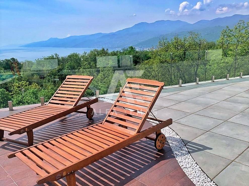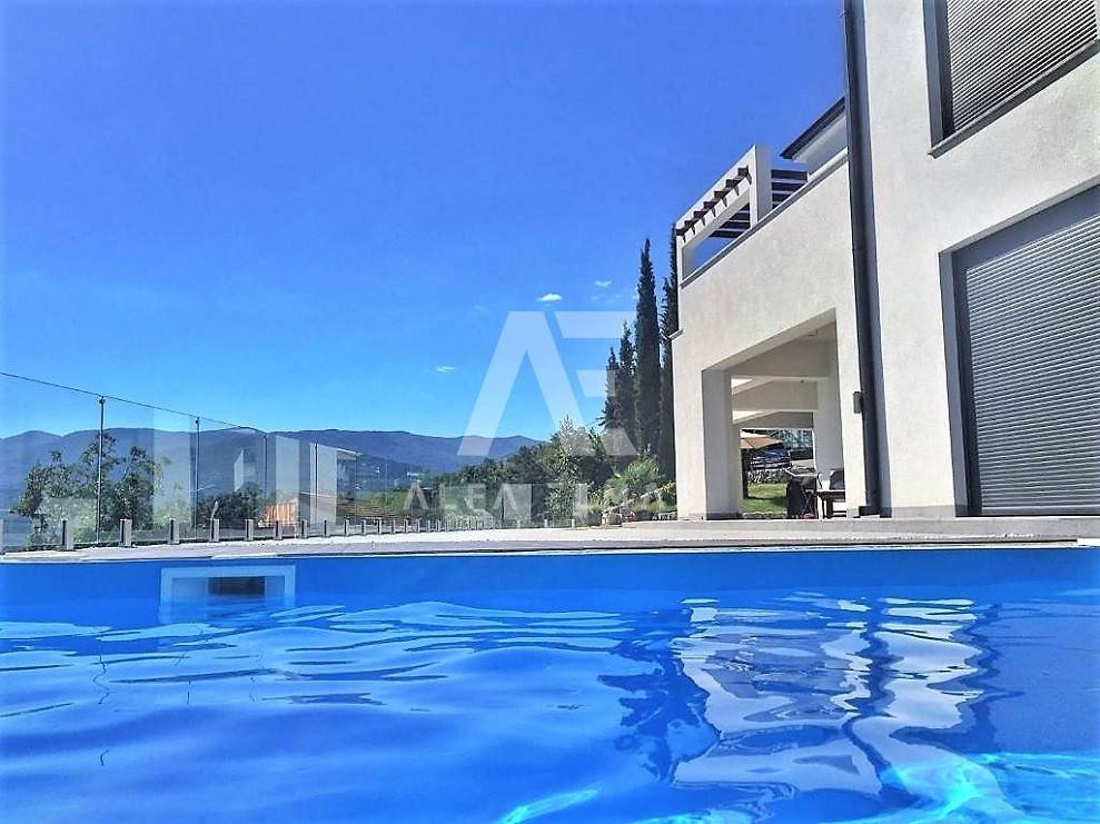 Kastav, a beautiful luxury villa with a pool and a panoramic view of the sea. The villa is located only 1350m from the sea, and has two floors: ground floor and first floor. The materials from which the villa was built are of top quality and from renowned manufacturers. The luxury villa consists of two separate apartments with a living area of ​​200m2. The apartments are fully furnished with first-class furniture and household appliances. Large glass walls offer a fabulous view of the Kvarner Bay from every room. The apartments have the same layout and consist of an entrance hall, two large bathrooms and one smaller bathroom for guests, walk-in wardrobes, three bedrooms, kitchen, dining room and living room from which there is an exit to the terrace with a magical view of the Kvarner bay!! The spacious garden has a swimming pool with a sunbathing area, indigenous plants, top-quality outdoor lighting and parking for several vehicles. The equipment of the villa includes high-quality ceramics and sanitary ware, air conditioning in all rooms, underfloor heating, TV. The villa is located in an attractive and quiet location near all facilities. Documentation in order!!
