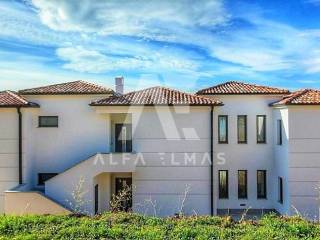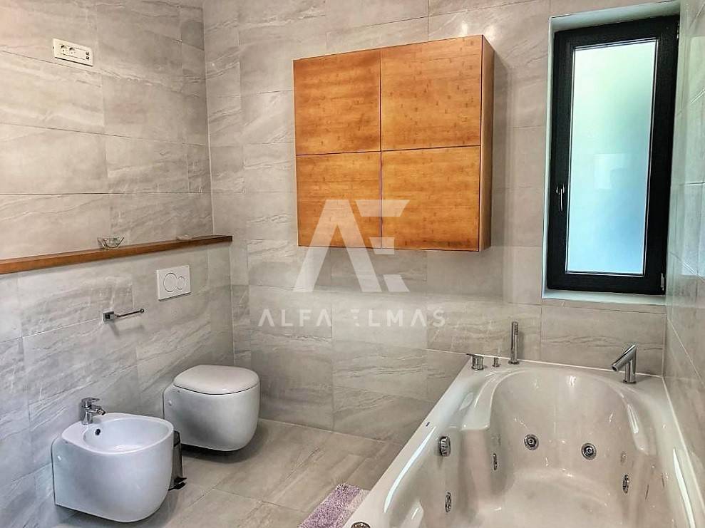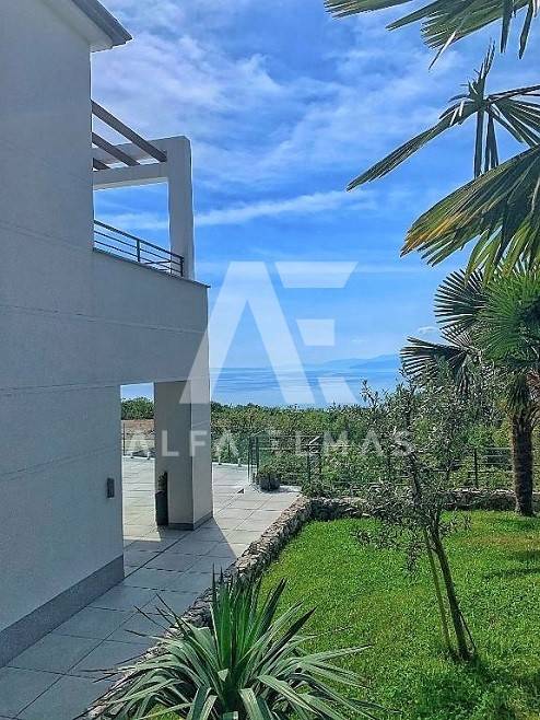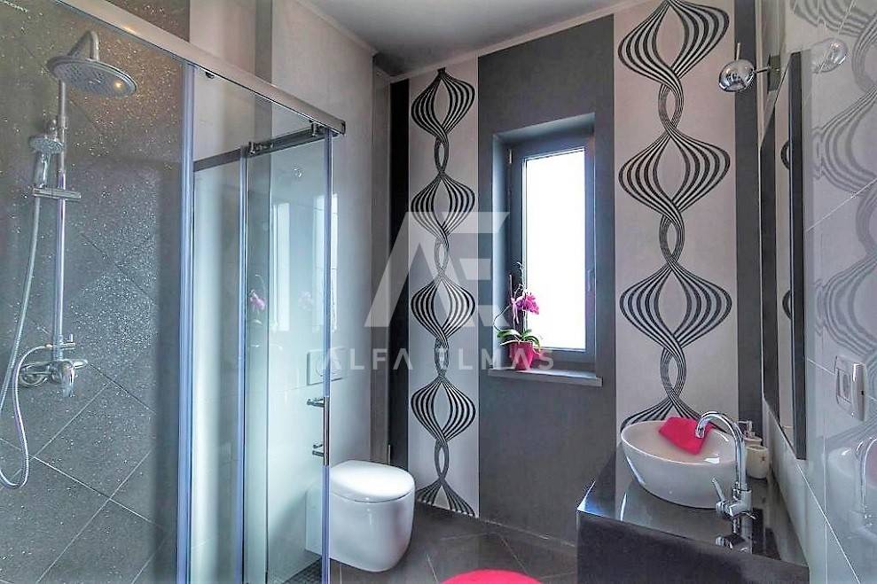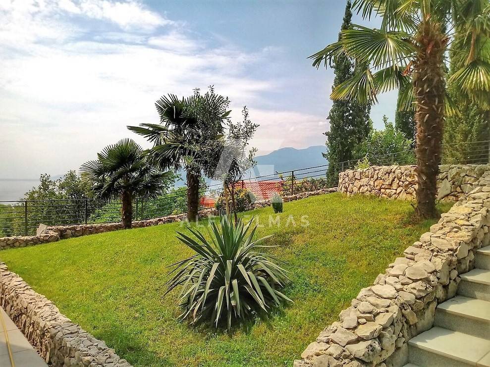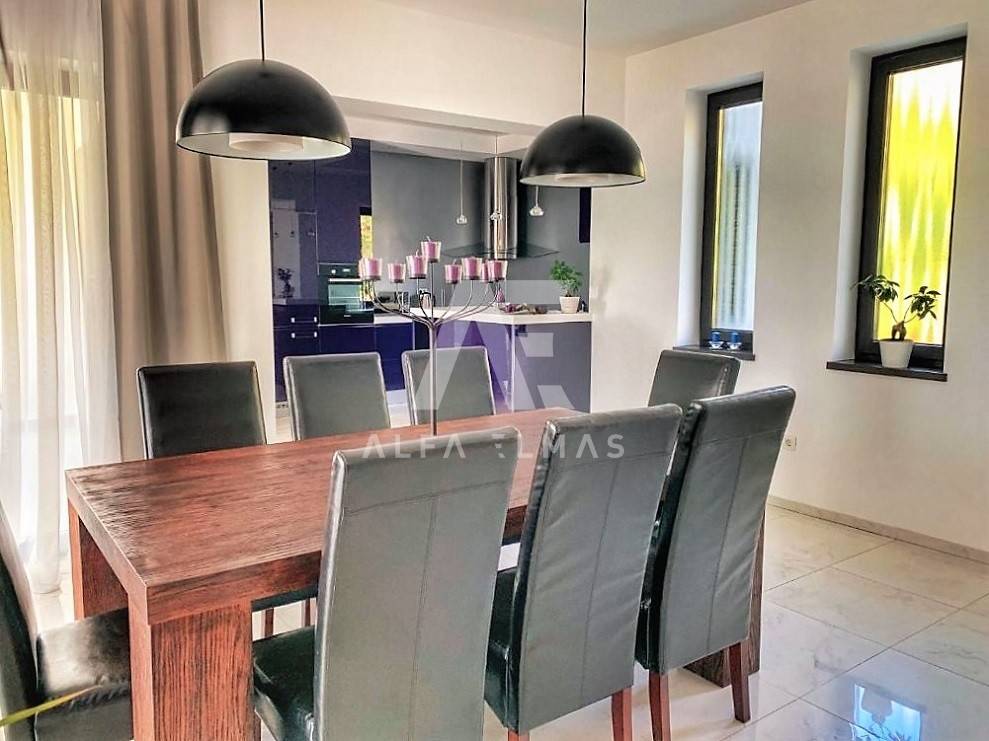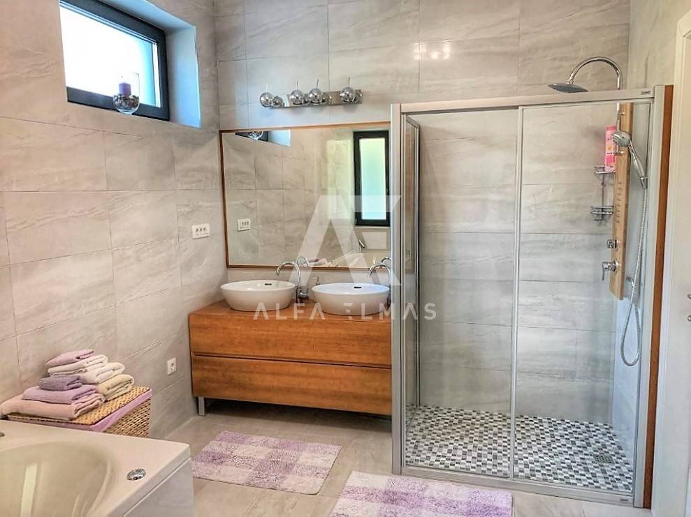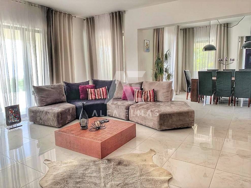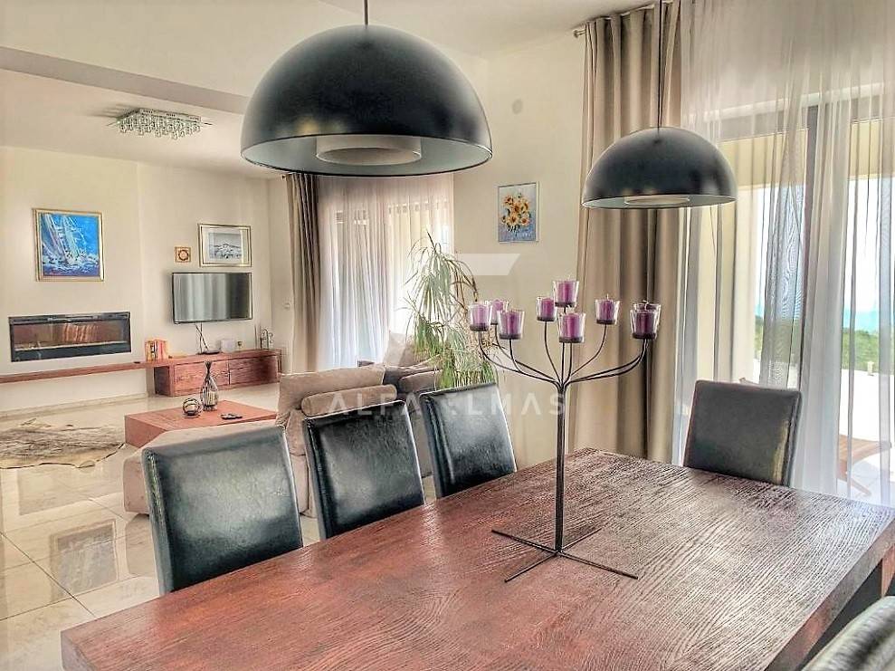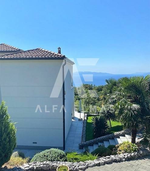 Kastav, a beautiful luxury villa with a pool and a panoramic view of the sea. The villa is located only 1350m from the sea, and has two floors: ground floor and first floor. The materials from which the villa was built are of top quality and from renowned manufacturers. The luxury villa consists of two separate apartments with a living area of ​​200m2. The apartments are fully furnished with first-class furniture and household appliances. Large glass walls offer a fabulous view of the Kvarner Bay from every room. The apartments have the same layout and consist of an entrance hall, two large bathrooms and one smaller bathroom for guests, walk-in wardrobes, three bedrooms, kitchen, dining room and living room from which there is an exit to the terrace with a magical view of the Kvarner bay!! The spacious garden has a swimming pool with a sunbathing area, indigenous plants, top-quality outdoor lighting and parking for several vehicles. The equipment of the villa includes high-quality ceramics and sanitary ware, air conditioning in all rooms, underfloor heating, TV. The villa is located in an attractive and quiet location near all facilities. Documentation in order!!