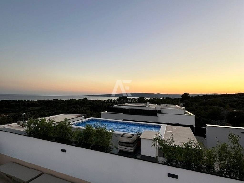 In the town of Krk, a two-level luxury apartment is for sale, located on the first floor of a modern urban villa, approximately 600 metres from the town centre and the beaches. The apartment has a net living area of 167 m², while the total usable gross area is 270 m², including terraces, the roof area and two parking spaces.