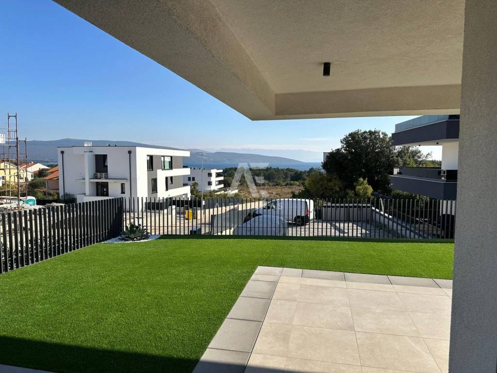 An external staircase leads to the entrance of the apartment, where there is a hallway and three bedrooms. Two of the bedrooms have their own bathrooms, and two share access to a 30 m² balcony. From the balcony, there is a view of the sea and the green surroundings of the island of Krk.