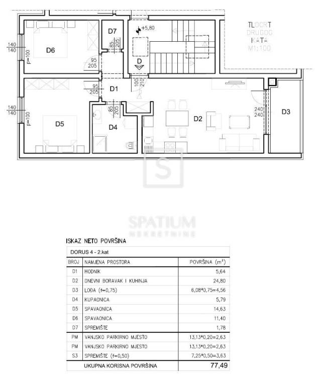 The apartment is located on the second floor of the building and has a total net surface area of 77.49 m², including the residential area, loggia, two parking spaces, and a storage room on the ground floor. The residential area of 68.60 m² consists of a spacious living room connected to the kitchen and dining area, two bedrooms, a bathroom, and a hallway, while the loggia provides a pleasant outdoor space for relaxation. The apartment is designed with an emphasis on optimal layout, abundant natural light, and a high level of comfort, making it ideal for family living as well as a long-term rental investment.