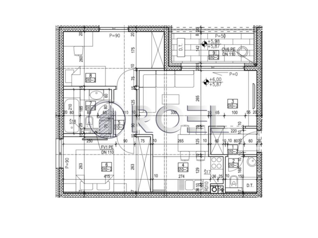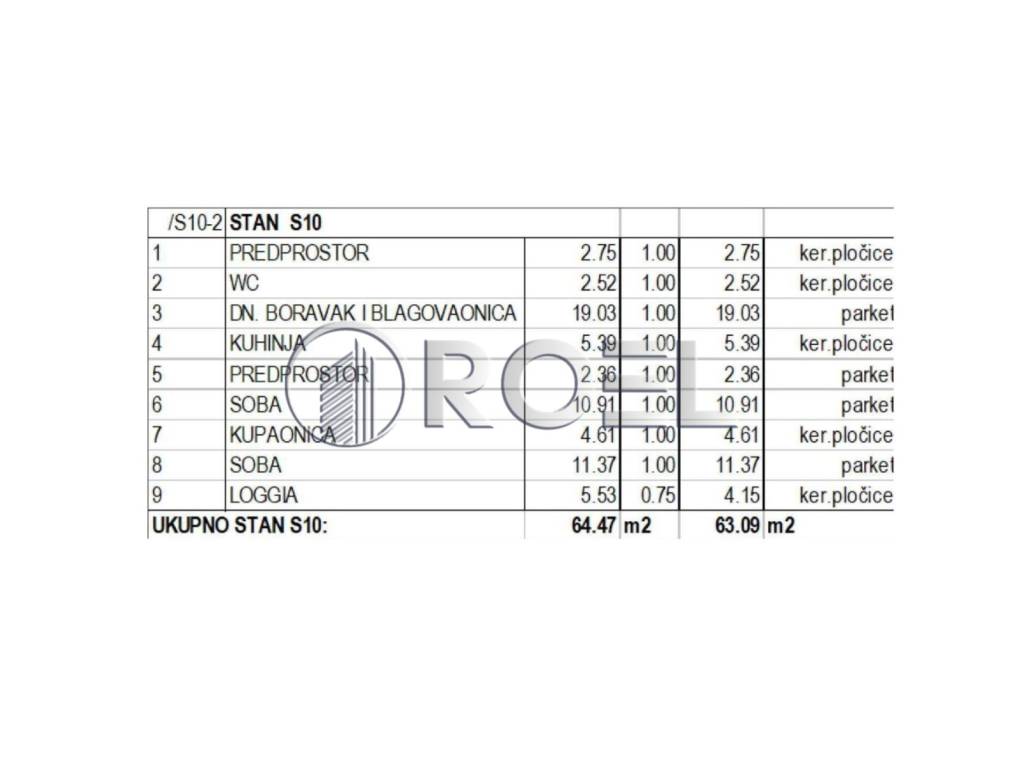 Three-bedroom apartment on the first floor of a new building with an elevator in the center of Zaprešić, NKP 63.09 m2. The building has three floors and there are a total of 34 apartments in the building. It consists of an entrance, a living room with a kitchen and a dining room with access to a loggia, two bedrooms and a bathroom with a toilet. The apartment is oriented to the west, northeast. An identical apartment is also available on the second floor.The apartments in the building will be equipped to high standards, aluminum joinery, electrically adjustable aluminum blinds, three-layer glass, the first glass of which is stopsol (reflective colored glass that reflects the sun's rays). The heating and cooling system is the latest and highest quality variant of heat pumps, which, with additional thermal insulation from rock wool (15 cm), result in savings of up to 70% compared to a classic heating system. It is possible to buy a garage space with the apartment, but it is not a requirement.