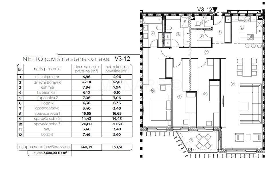 Prodaje se 4-sob. stan V3-12 ukupne površine 140,37 m2 (obračunato po koeficijentu - neto korisne površine 138,51 m2), a sastoji se od ulaznog prostora, dnevnog boravka, kuhinje, kupaonice 1, kupaonice 2, hodnika, gospodarstva, 3 spavaće sobe, wc-a i loggie površine 7,46 m2 (neto površine 5,60 m2).