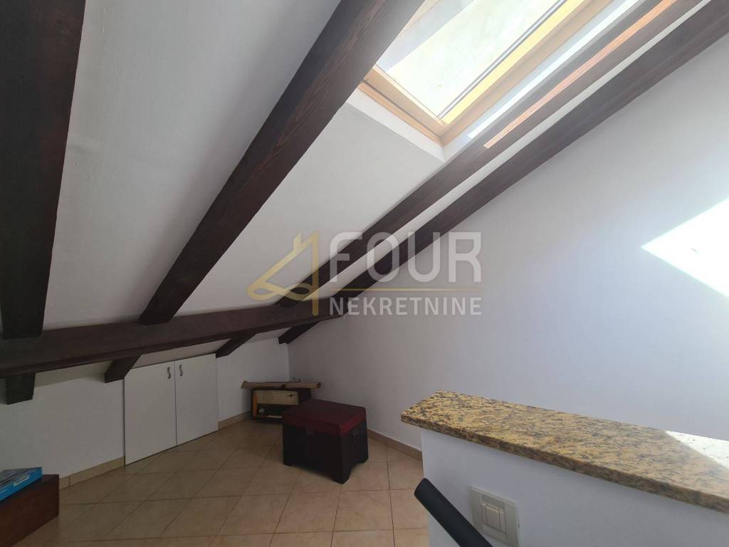 The house extends through the ground floor, 1st floor, 2nd floor and high attic, with a total area of ​​75m2 and consists of a kitchen with dining room and living room, two bedrooms and two bathrooms. The high attic is used as a storage room, but it can be arranged and function as another bedroom.