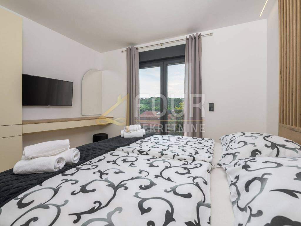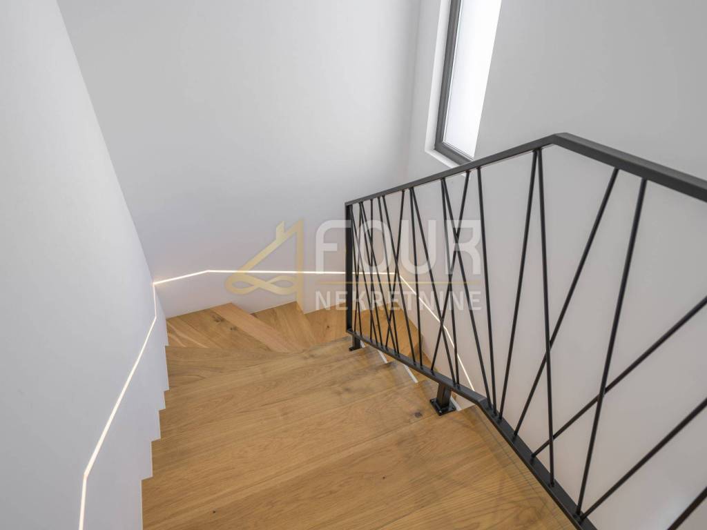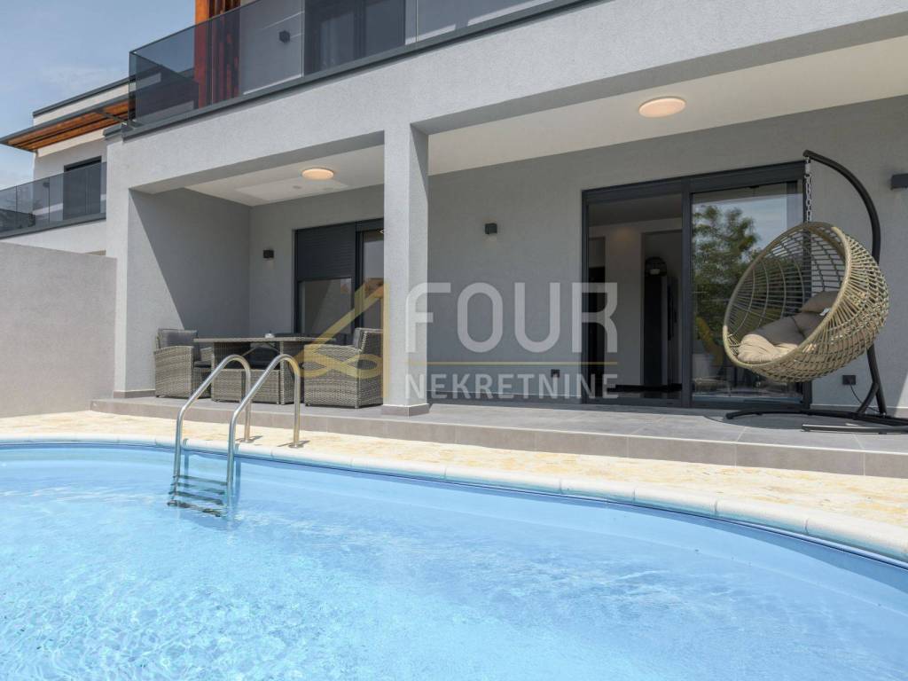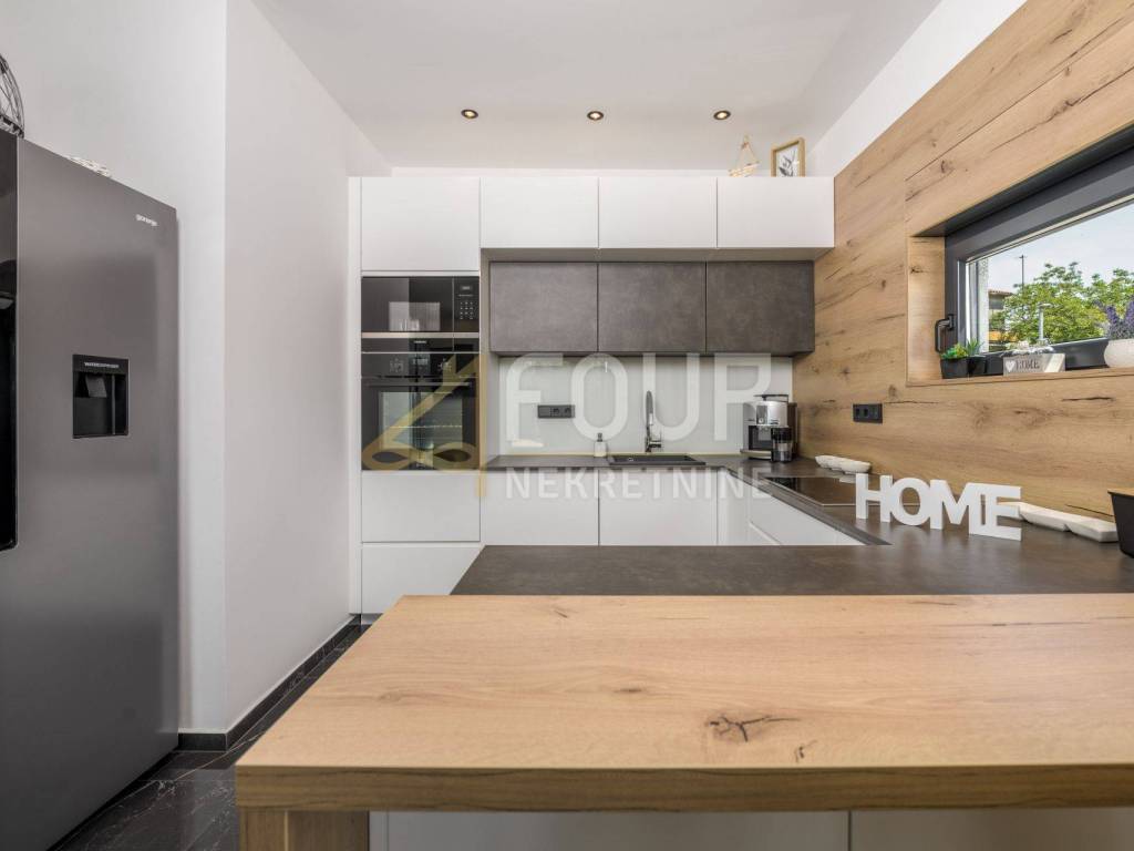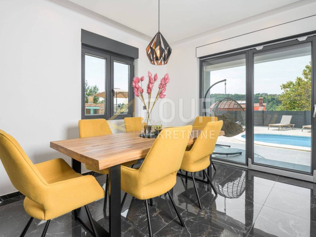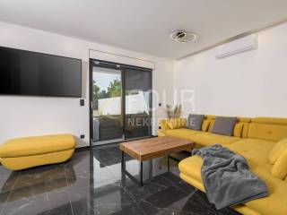 A prefabricated house with a swimming pool and a view of the old town is for sale in the center of Labin. The house has 130m2 of living space and consists of a ground floor and a first floor. On the ground floor of the house there is a spacious living room, a kitchen with a dining room, a bathroom, a storage room and a covered terrace. There are three bedrooms, a bathroom and a terrace on the first floor. The house is equipped with top quality furniture and household appliances. The bathrooms have underfloor heating. There is a swimming pool with a sun deck on the 370m2 garden.