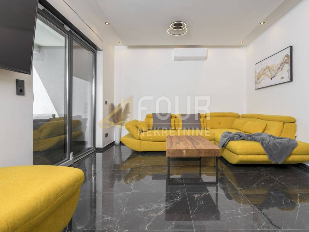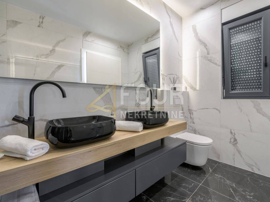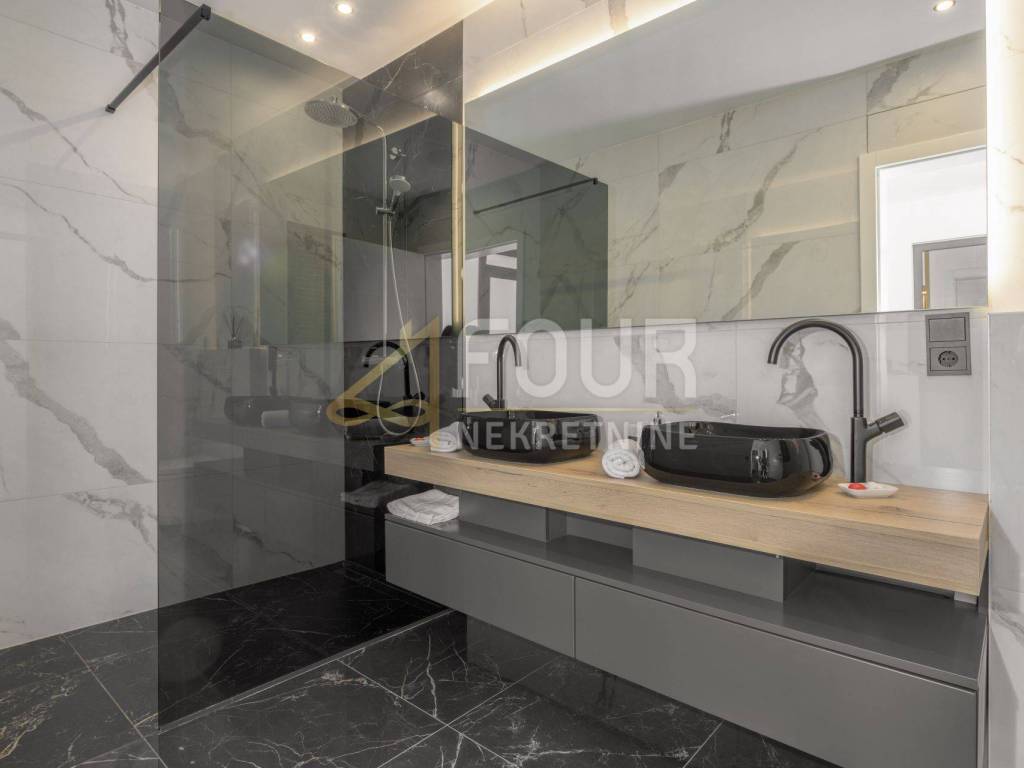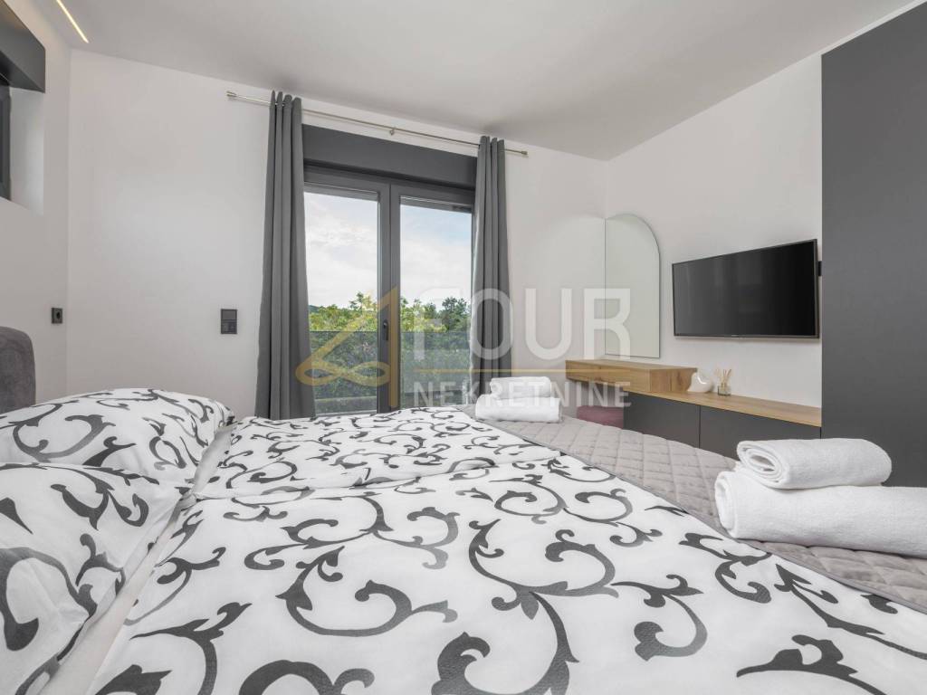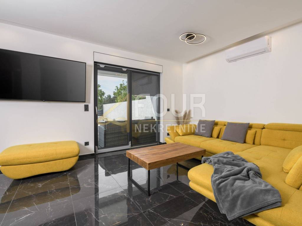 A prefabricated house with a swimming pool and a view of the old town is for sale in the center of Labin. The house has 130m2 of living space and consists of a ground floor and a first floor. On the ground floor of the house there is a spacious living room, a kitchen with a dining room, a bathroom, a storage room and a covered terrace. There are three bedrooms, a bathroom and a terrace on the first floor. The house is equipped with top quality furniture and household appliances. The bathrooms have underfloor heating. There is a swimming pool with a sun deck on the 370m2 garden.