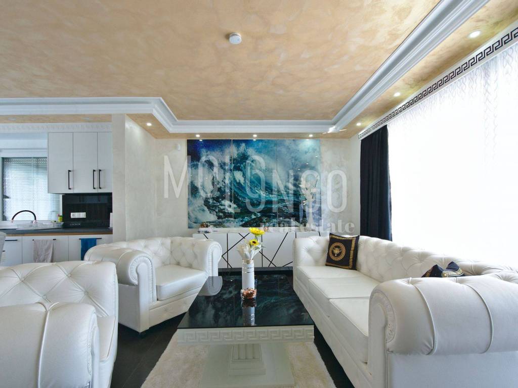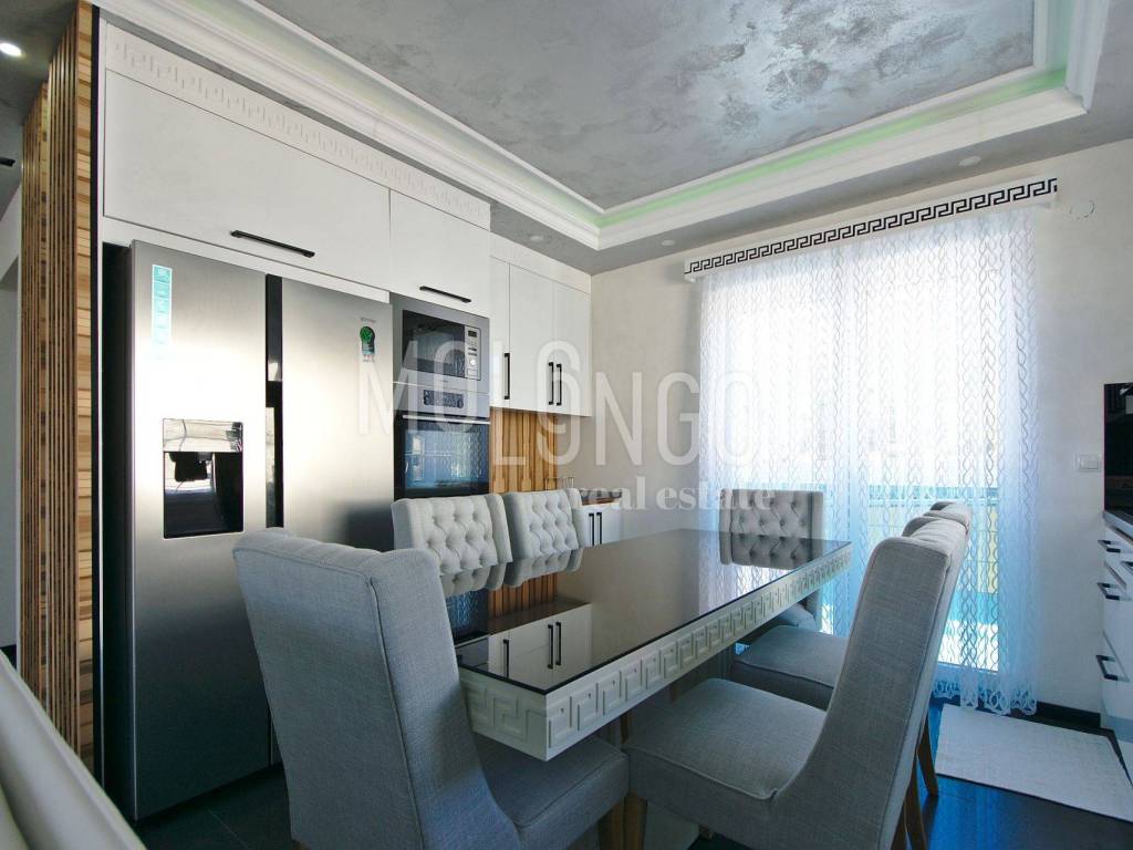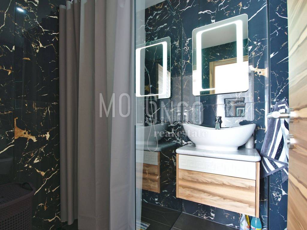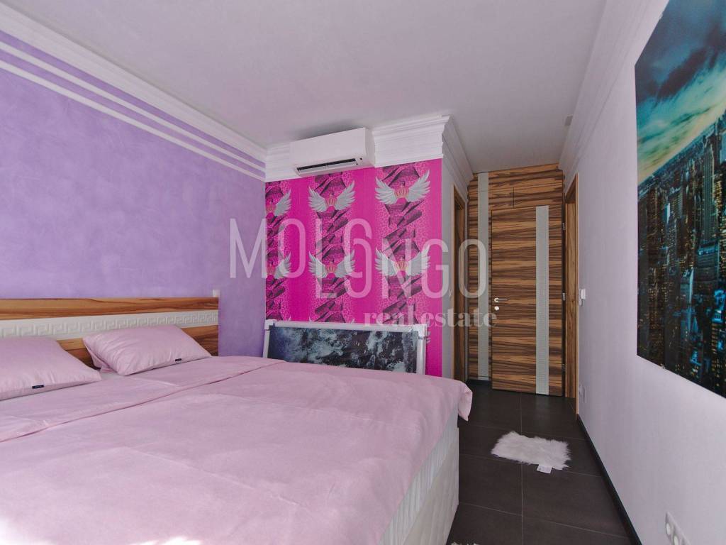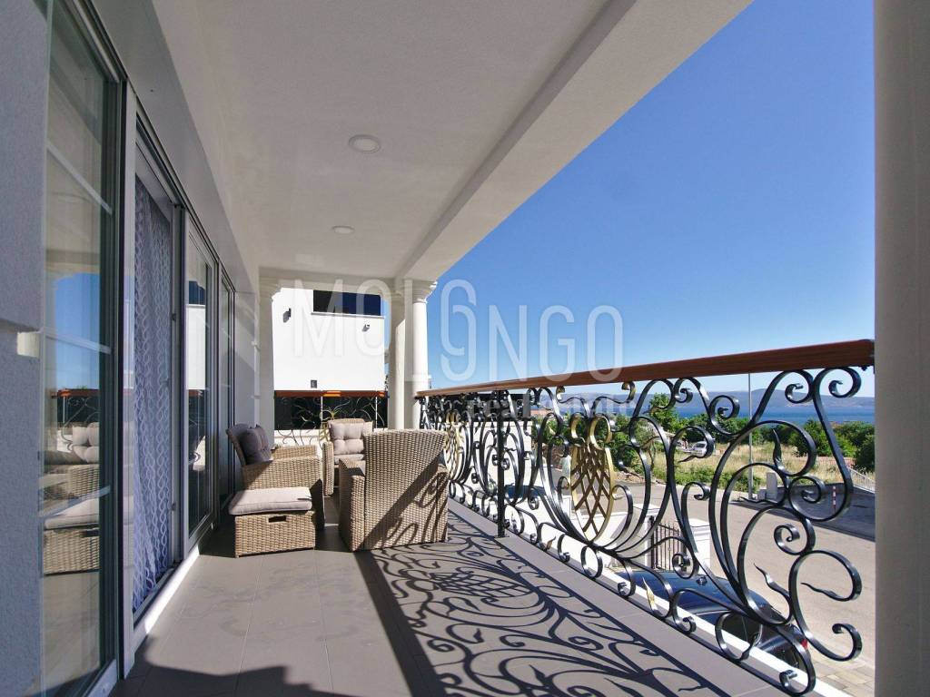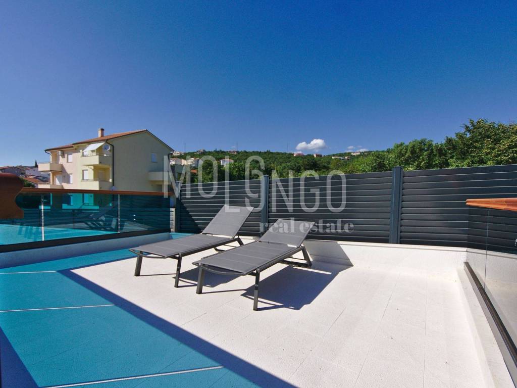 The luxuriously furnished new house is located on the Crikvenica Riviera, at a distance of 250 meters from the sea. The house has a ground floor and two floors . On the first and second floor there are two identical three-room apartments, each with an area of 125 m². Each apartment has a large south-facing terrace with a beautiful view of the sea, while each room in the apartment has its own bathroom. There are four large garages on the ground floor.