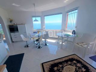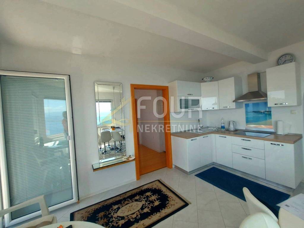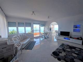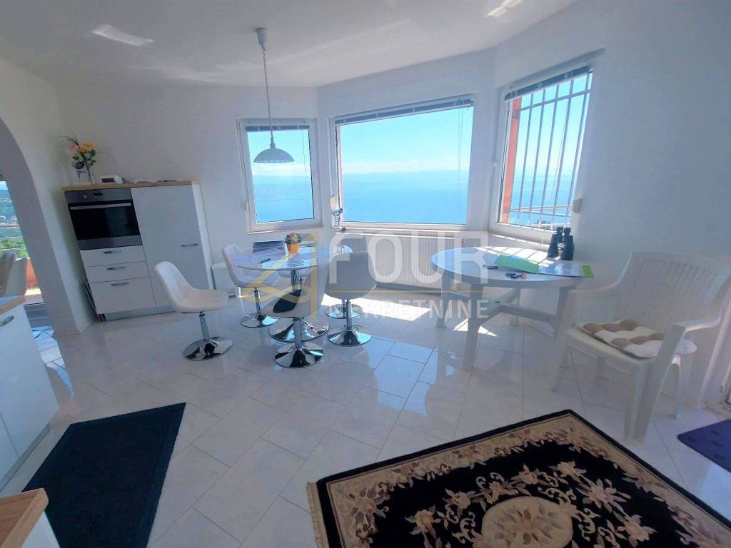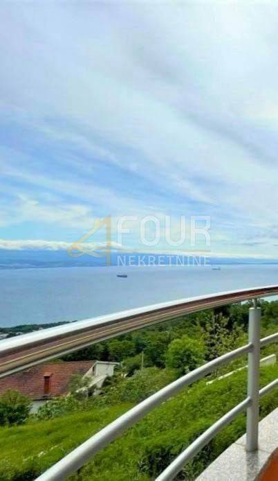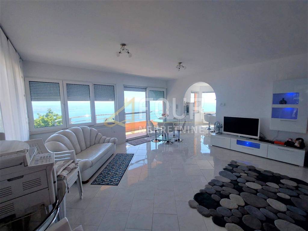 Excellent property! Furnished apartment with a panoramic view of the sea and Kvarner! It is located in a newly built building in a quiet location near Lovran, only 15 minutes by car from the beach and the sea. The area of the apartment is 98.75m2 and it is located on the first floor. It consists of a kitchen with a dining room and a spacious living room, two bedrooms, two bathrooms, a hallway, a balcony and a spacious terrace.