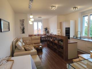 The interior space is carefully designed and functionally distributed: on the ground floor there is an entrance with a bathroom and storage that can easily be converted into an office or guest room. The first floor features a spacious kitchen with a dining area and living room, a bedroom, a bathroom, as well as additional hallway and storage space. The attic offers another large living room with access to a terrace, two bedrooms, and a luxury bathroom with a bathtub and shower cubicle. The apartment is full of natural light thanks to large roof windows with electronic controls.