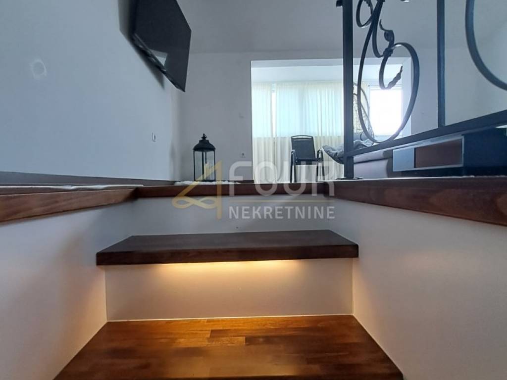 The interior comprises a two-level apartment with a bedroom and bathroom on the ground floor, while the upper floor features a kitchen and living room, creating a cozy and functional space.
