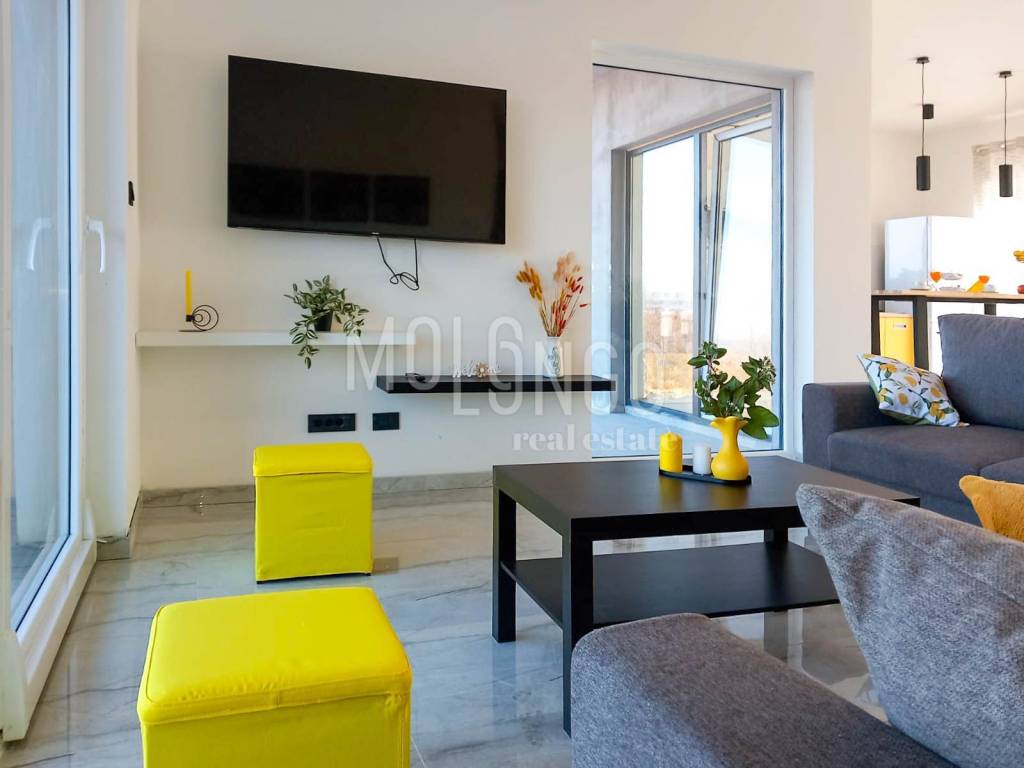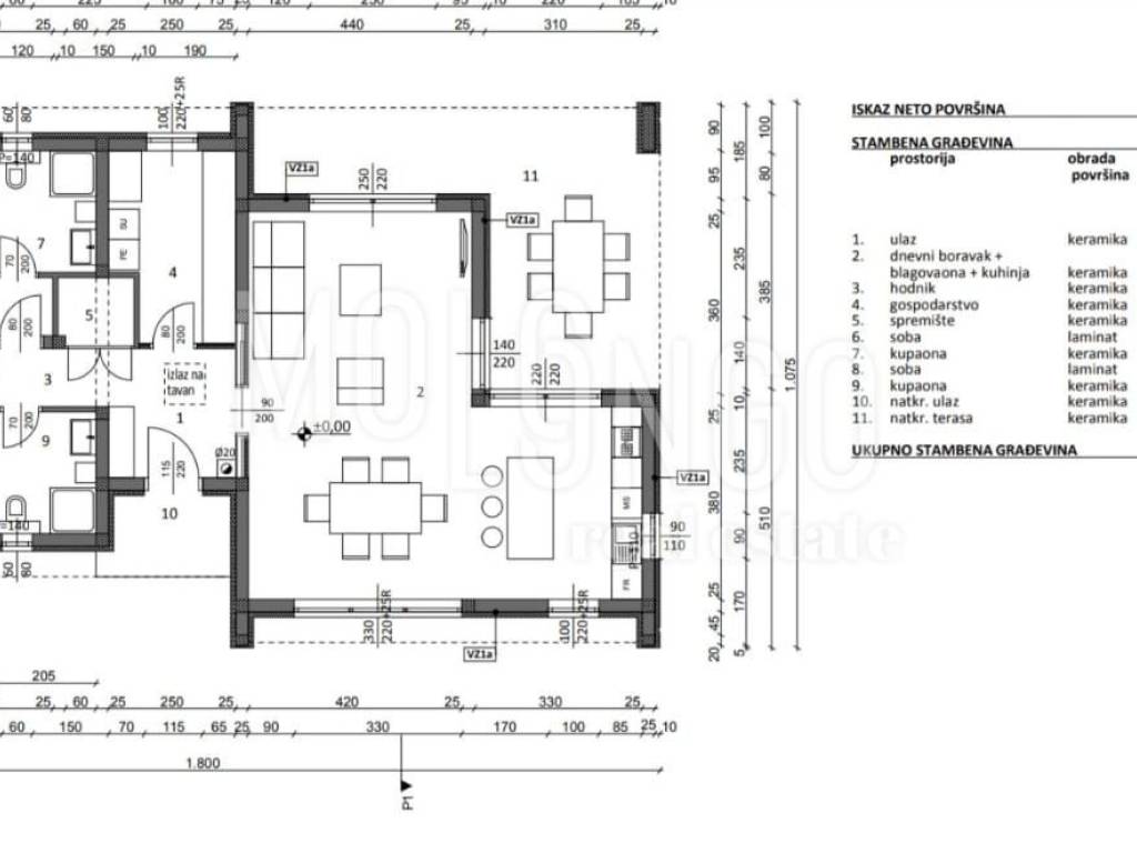 It is located on a spacious plot of land of 1034 m2, with a total living area of 125 m2. The central part of the floor plan of the house is a spacious open space that includes the living room, dining room and kitchen, with plenty of natural light through large glass walls. This space has a direct exit to the terrace and the 7x3.5m pool. The house has three bedrooms and two bathrooms. Air conditioners are used for heating and cooling.