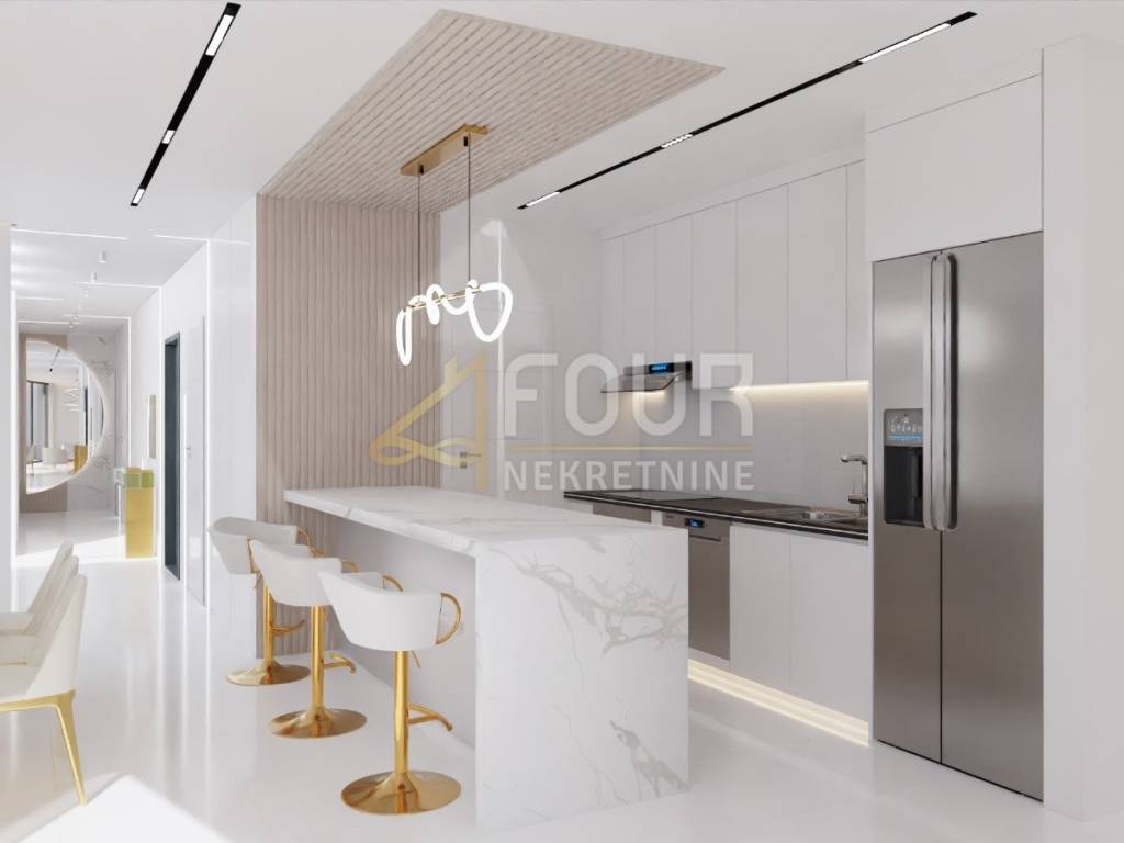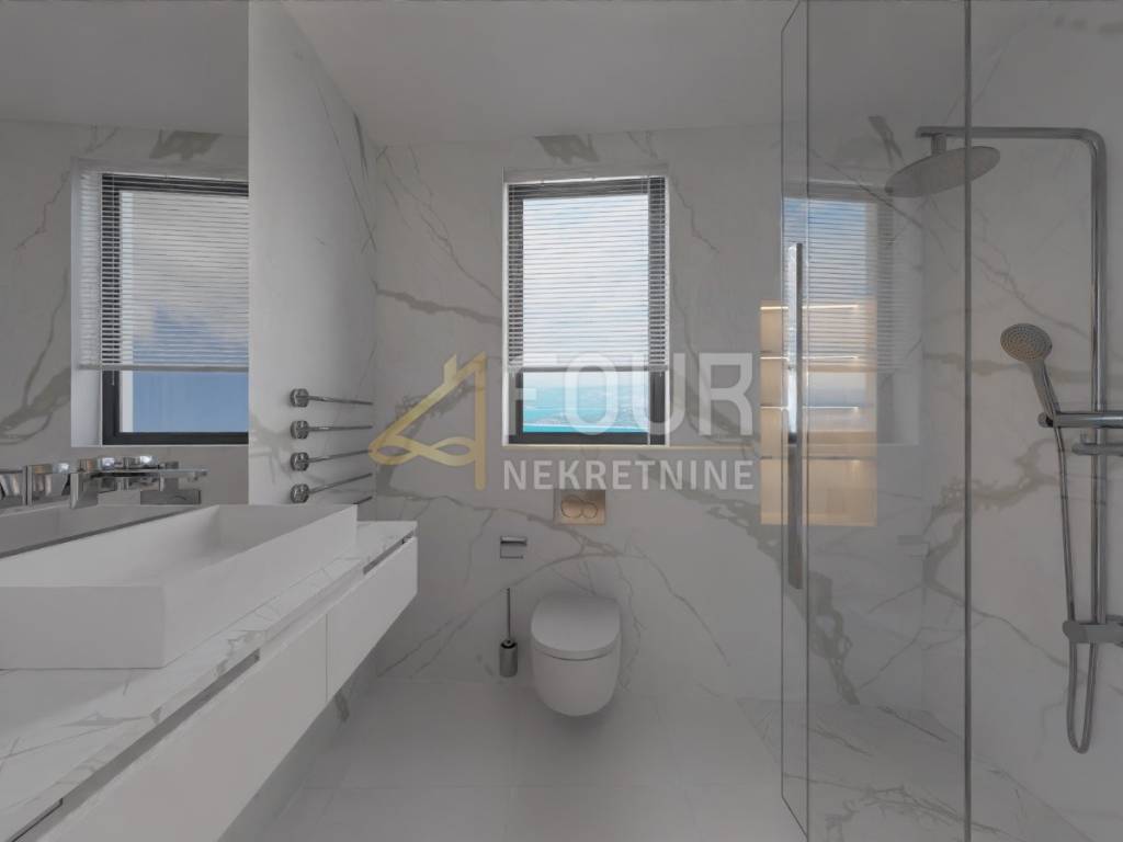 The apartment with a total area of 195 m2 facing south, east, and west features spaciousness, contemporary design, and a panoramic sea view.