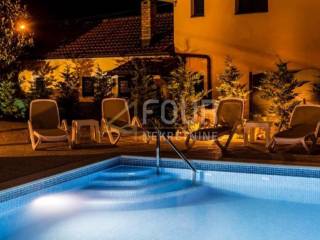 The pool is equipped with water heating, and in addition to the pool with a sunbathing area, there is a large lawn, a fireplace, a covered terrace and a parking space for 8 cars.