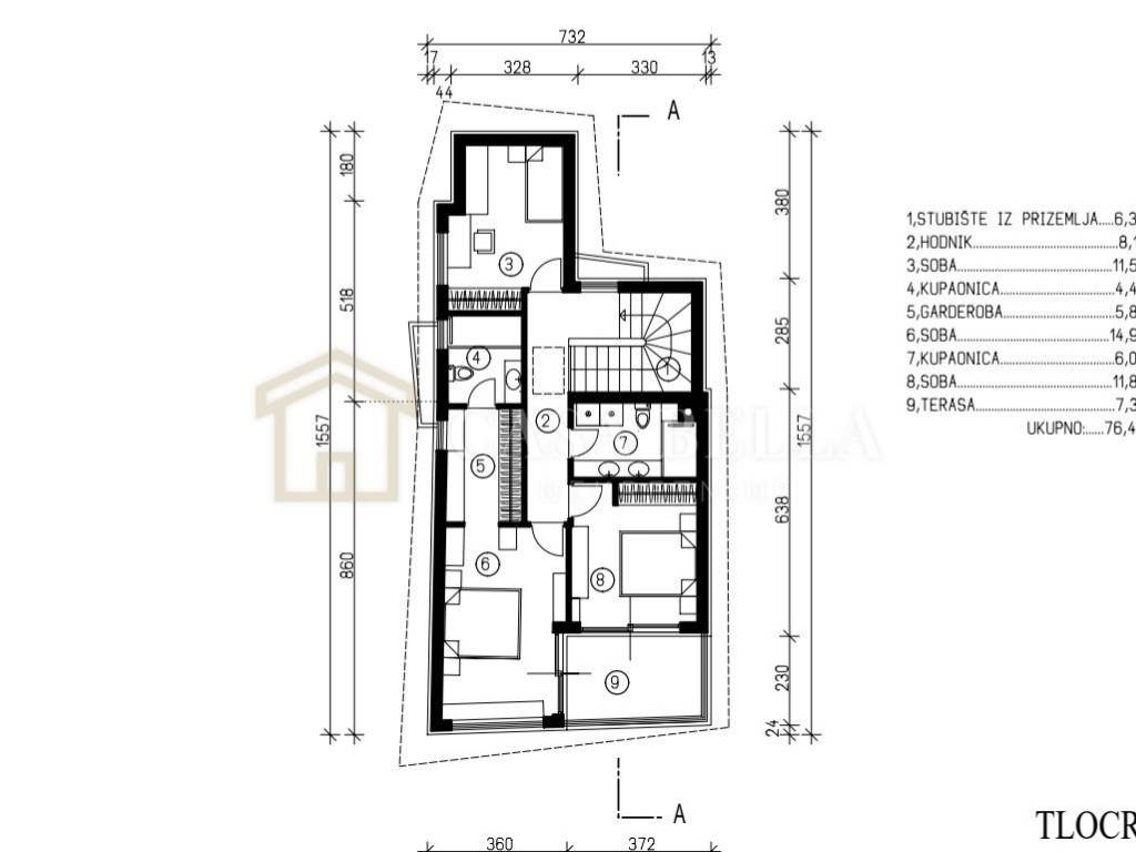 - Kat: Master spavaća soba s garderobom i kupaonicom, dvije spavaće sobe, kupaonica i terasa