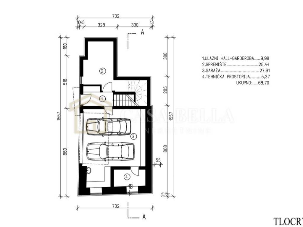 - Suteren: Garaža za dva automobila, spremište i tehnička prostorija