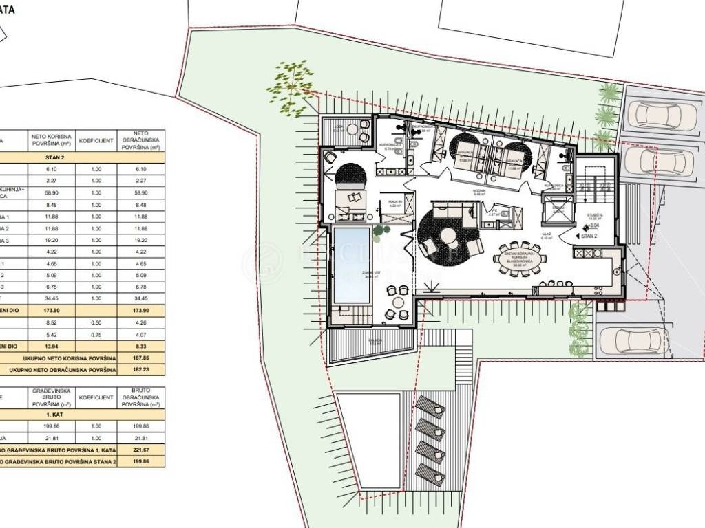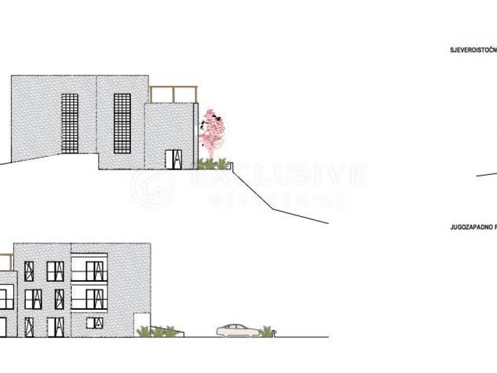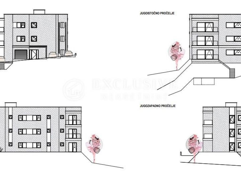 Stambena zgrada (podrum, prizemlje, 1.kat, 2.kat) sa sveukupno 3 stana (3 S+DB stanovi s 3 kupaonice, balkonima, terasama, bazenom, garažom, liftom i auto dizalom - ukupne brutto građevinske površine 882,71 m2)