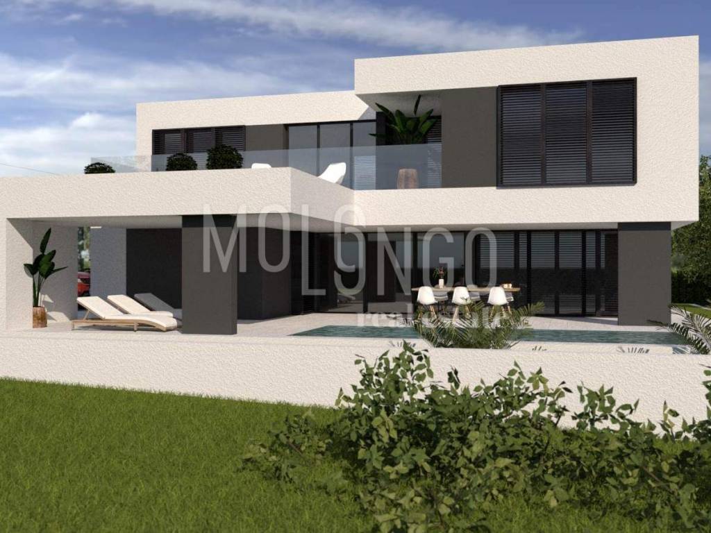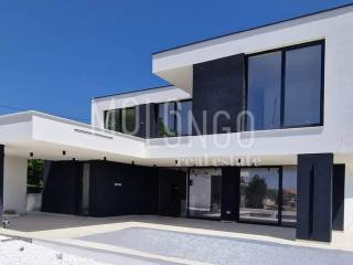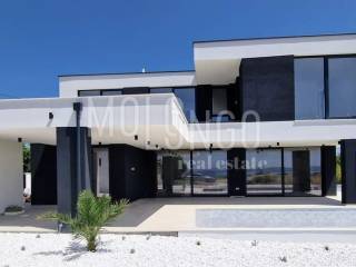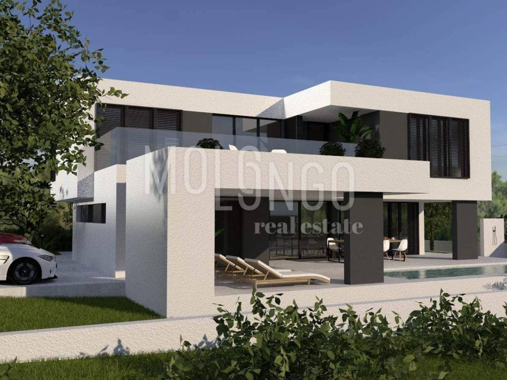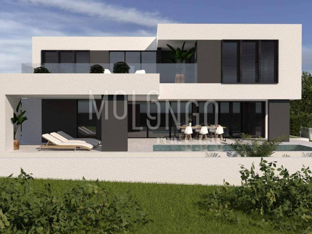 BEAUTIFUL MODERN VILLA consisting of ground floor and first floor. Total area 240 m2. On the ground floor there is: a living room with a kitchen and a dining room, a room with a sauna, a storage room, a bathroom, a terrace with a view of the pool and a sunbathing area. The villa has an open view of the sea and there is nothing built in front of it. The dimensions of the pool are 9 x 3.5 m, and one side of the pool is completely glazed. Near the sunbathing area there is an attractive waterfall 1.5 m wide and 2.5 m high that flows into the pool. There are three bedrooms on the first floor. Each has its own bathroom and access to a spacious terrace. The master bedroom also has its own walk-in closet. The heating is underfloor with a built-in heat pump. There is air conditioning in every room. The ground floor has ceramics, and the rooms have parquet. The ground floor and the first floor are connected by a high-quality iron staircase. The yard consists of a combination of river sand and artificial grass. The size of the plot is 560 m2.
