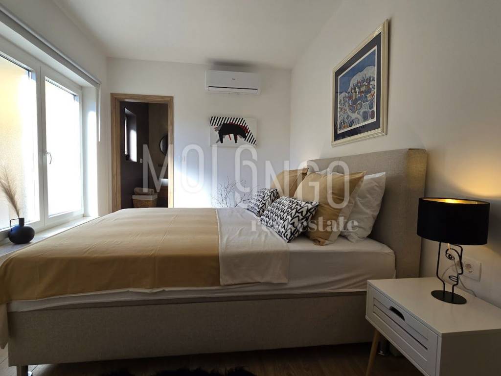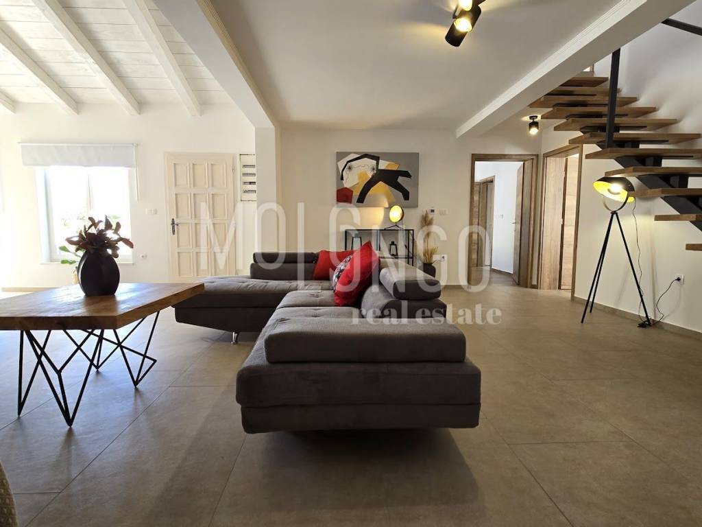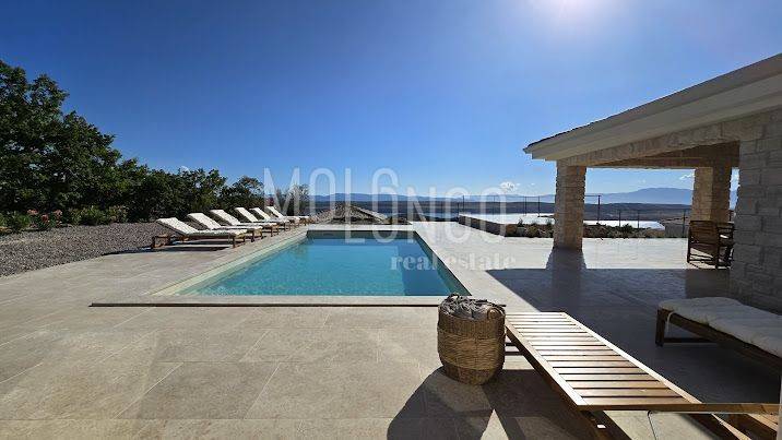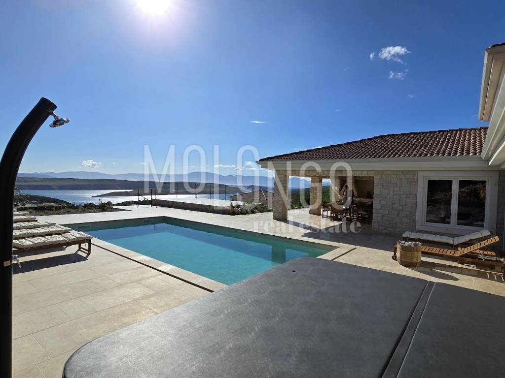The stone Villa has a rustic style, built with Istrian Kanfanar stone, with an area of 200 m2 + 36 m2 garage + 10 m2 engine room + 35 m2 heated swimming pool with water electrolysis and ceramics installed in the pool, while the total area of the land, which is decorated with autochthonous Mediterranean plants, olive trees , with natural rocks as much as 1200 m2. Located in one of the most beautiful locations in Kvarner, in Jadranovo, the villa represents a perfect combination of tradition and luxury. In its interior, it hides a modernly equipped interior with all the necessary contents for undisturbed enjoyment of your dream vacation or residence. Accommodation capacity for eight people, the villa has 4 bedrooms with ensuite bathrooms. On the ground floor of the villa there are two bedrooms, a spacious bright living room with an additional sofa bed for two people, and a modern kitchen with a dining room. On the upper floor there are two more bedrooms with a panoramic view of the sea. The entire space is air-conditioned, a heat pump (floor heating) and a fireplace are installed. On the terrace of the villa, which is paved with stone, there is a beautiful, ceramic-lined heated swimming pool with water electrolysis, size 35 m2 and depth 1.7 m, then a hydromassage tub (jacuzzy) for 6 people, eight sun loungers with cushions, an outdoor table for dish made of Slavonian oak and outdoor masonry stone grill. In the completely fenced yard of the villa, you also have 2 parking spaces in the garage. The villa is located in an isolated location far from the city noise and hustle and bustle, and is surrounded by greenery and untouched nature where you will be able to enjoy the smell of clean air and pine trees. The surroundings of the maritime town of Jadranovo offer a variety of offers in which everyone will find something to their own taste. The nearest beach is 900 meters from the villa, where you can enjoy the crystal clear Adriatic Sea and have fun with water sports such as swimming, diving, sailing or fishing.