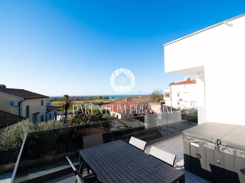 Istria, PorecNear Poreč, this excellent quality apartment is located on the 1st floor of a modern building with a jacuzzi on the terrace, with a total area of ​​96,56m2.This apartment consists of an entrance hall, three spacious bedrooms, one of which has its own balcony, two bathrooms, one of which is in the master bedroom, and an additional guest toilet. The living room, dining room and kitchen are made according to the open space model with access to the terrace of 19.14 m2.The living room leads to a covered terrace with a beautiful view and a jacuzzi, ideal for summer relaxation and enjoyment.The building was built to very high standards, the floors are covered with stone, ceramic or wood, depending on the purpose.The exterior joinery is aluminum with three-layer thermopane glass, while the interior joinery is wooden.Heating and cooling are provided by multi-split inverter air conditioners built into the walls.There is a storage room in the basement of the building.In front of the building there is a covered parking lot for 2 vehicles.The apartment is sold fully equipped with custom-made furniture.The building is subject to VAT, which is included in the price and the buyer is exempt from paying real estate tax.A quiet location not far from the beautiful city of Poreč along with high-quality content and quality makes this apartment an excellent opportunity for your future investment.