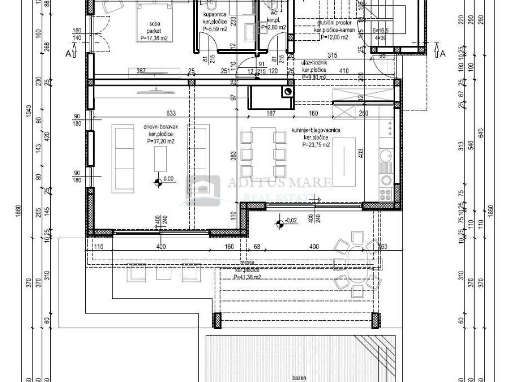 U prizemlju se nalazi pomoćni objekt površine 11,31m2 a bazen ima dimenzije 7,75x4m (30,22m2)