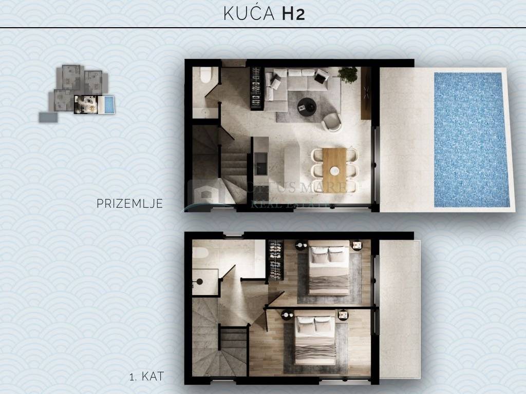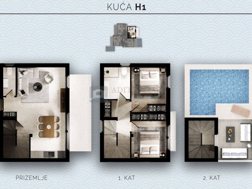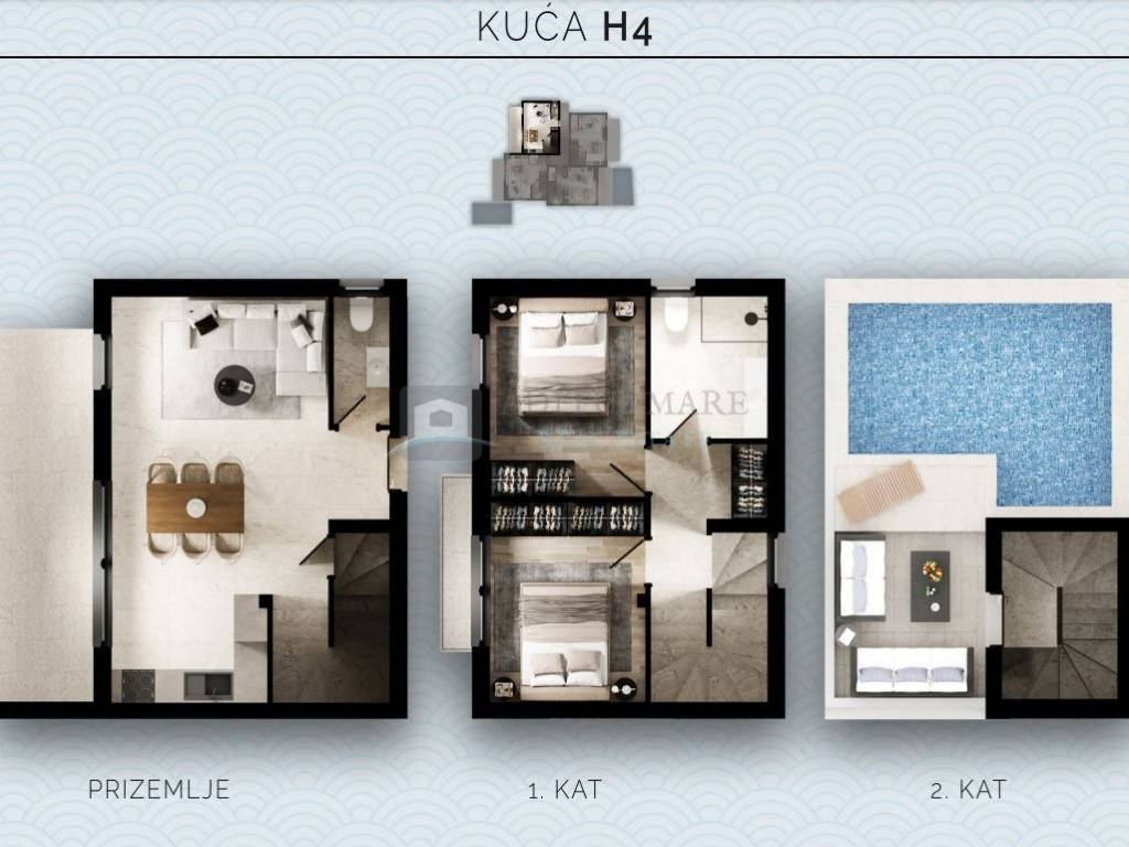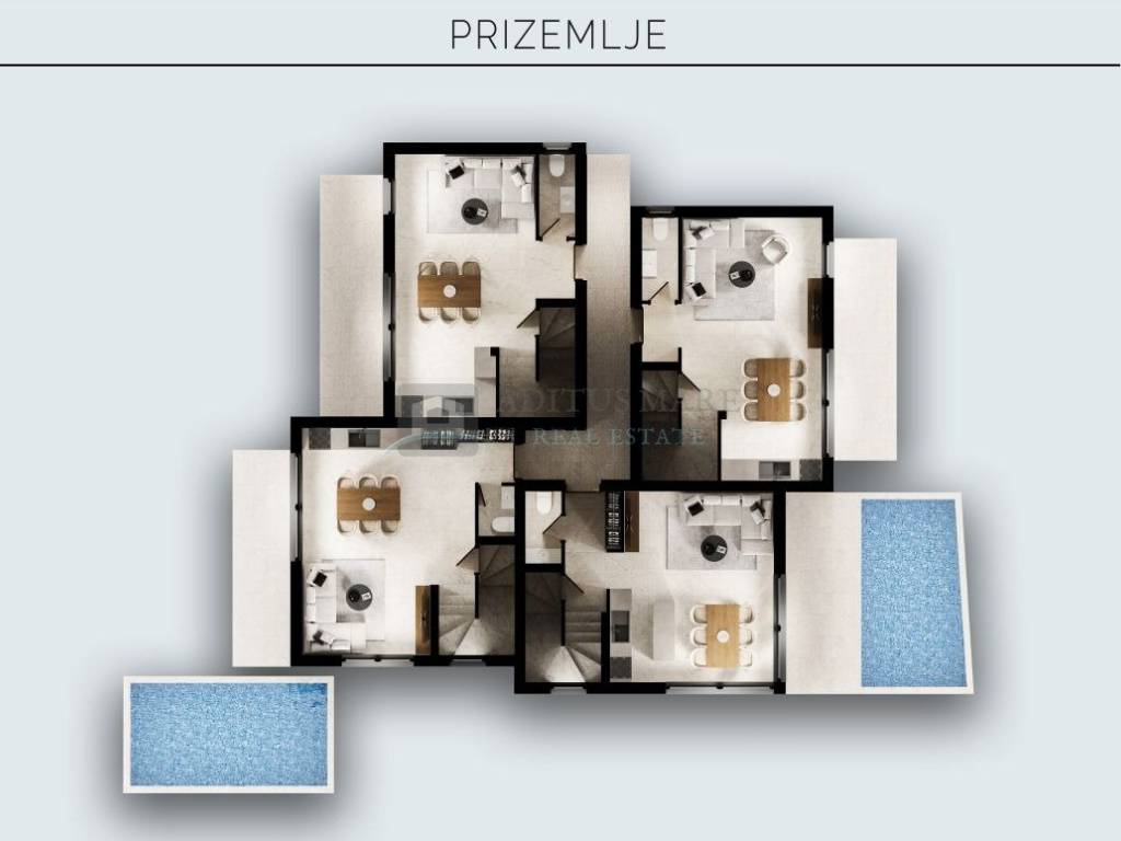 Svaka dvoetažna kuća imat će vlastiti ulaz, bazeni se nalaze u prizemlju kuće H2 i H3 dok su preostala dva krovna bazena i pripadaju kućama H1 i H4.