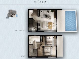 -Kuća H2 prostire se na podrum, prizemlje i prvi kat. Raspolaže korisnom površinom sa uračunatim koeficijentima 98.42m2.