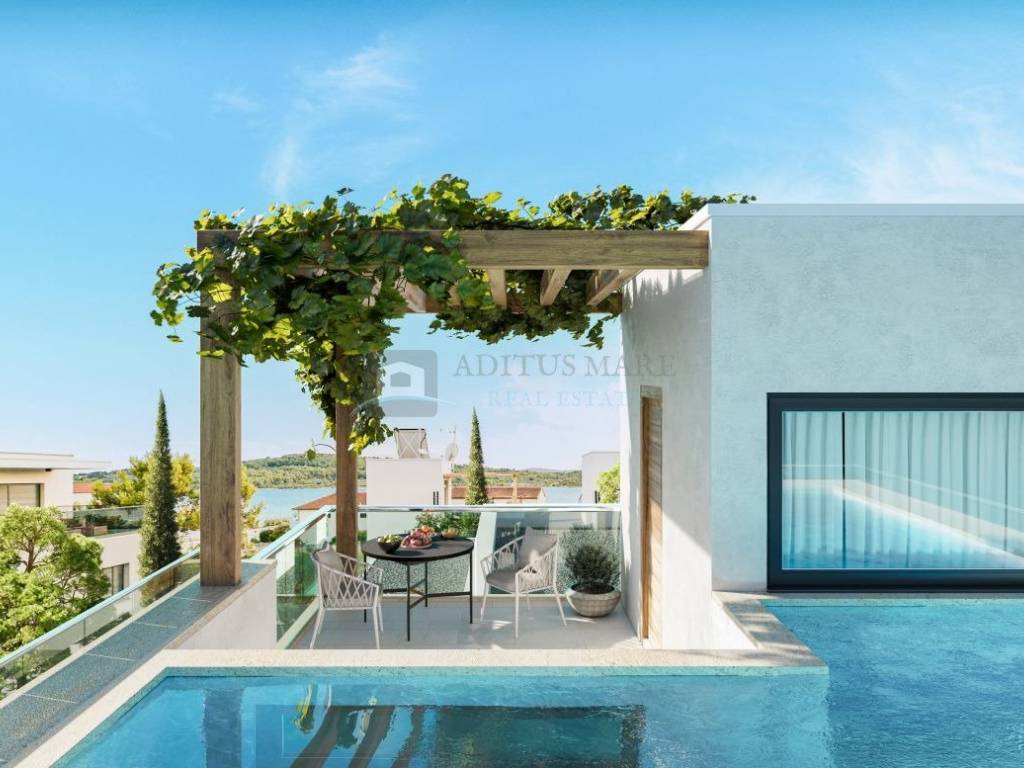 Drugi kat: stepenište, krovna terasa sa bazenom i panoramskim pogledom na more.