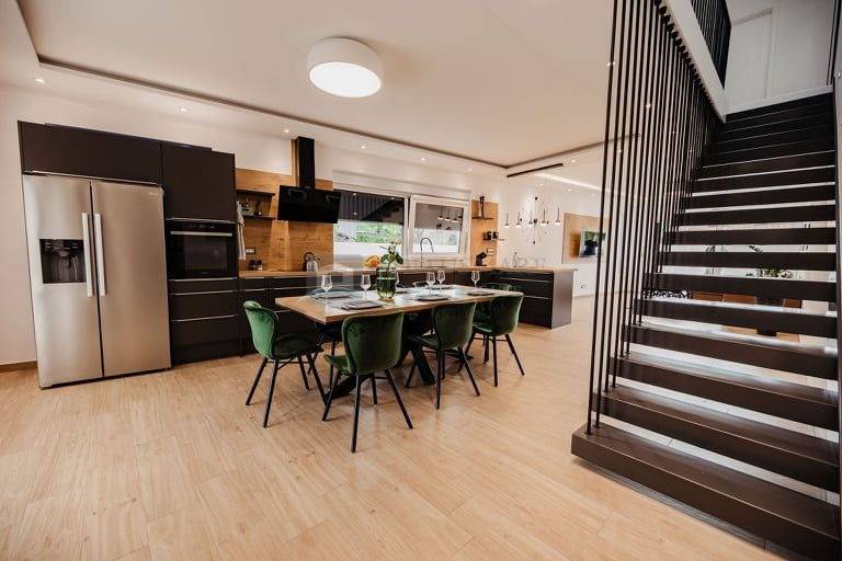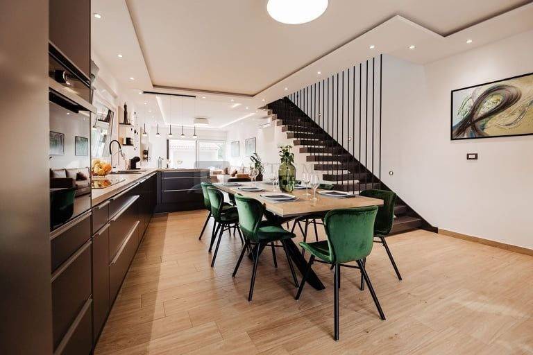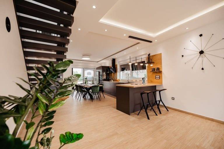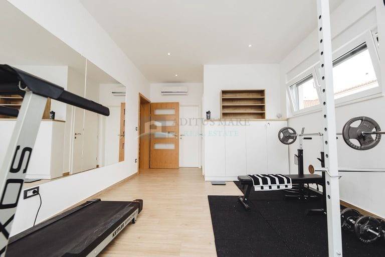 Također, prizemlje se sastoji od velikog open space dnevnog boravka sa kuhinjom i blagavaonicom, teretane, zahoda i spremišta.