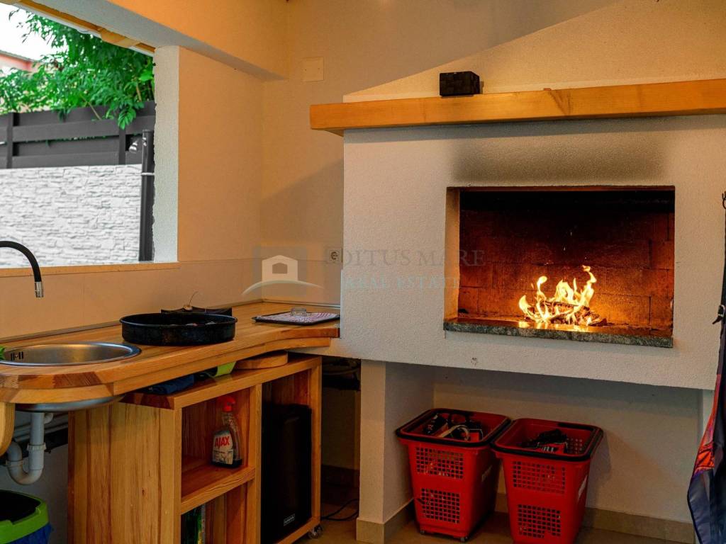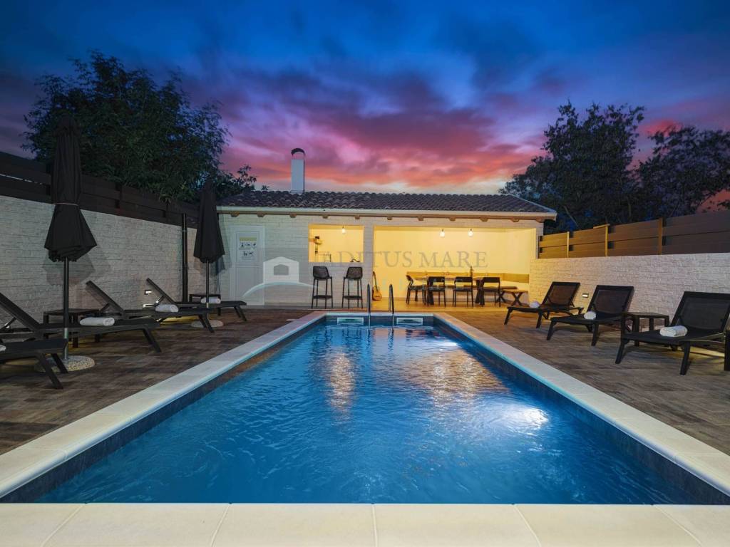 Villu krasi prekrasno dvorište i uređena okućnica, grijani bazen te prostor za druženje sa ljetnom kuhinjom.