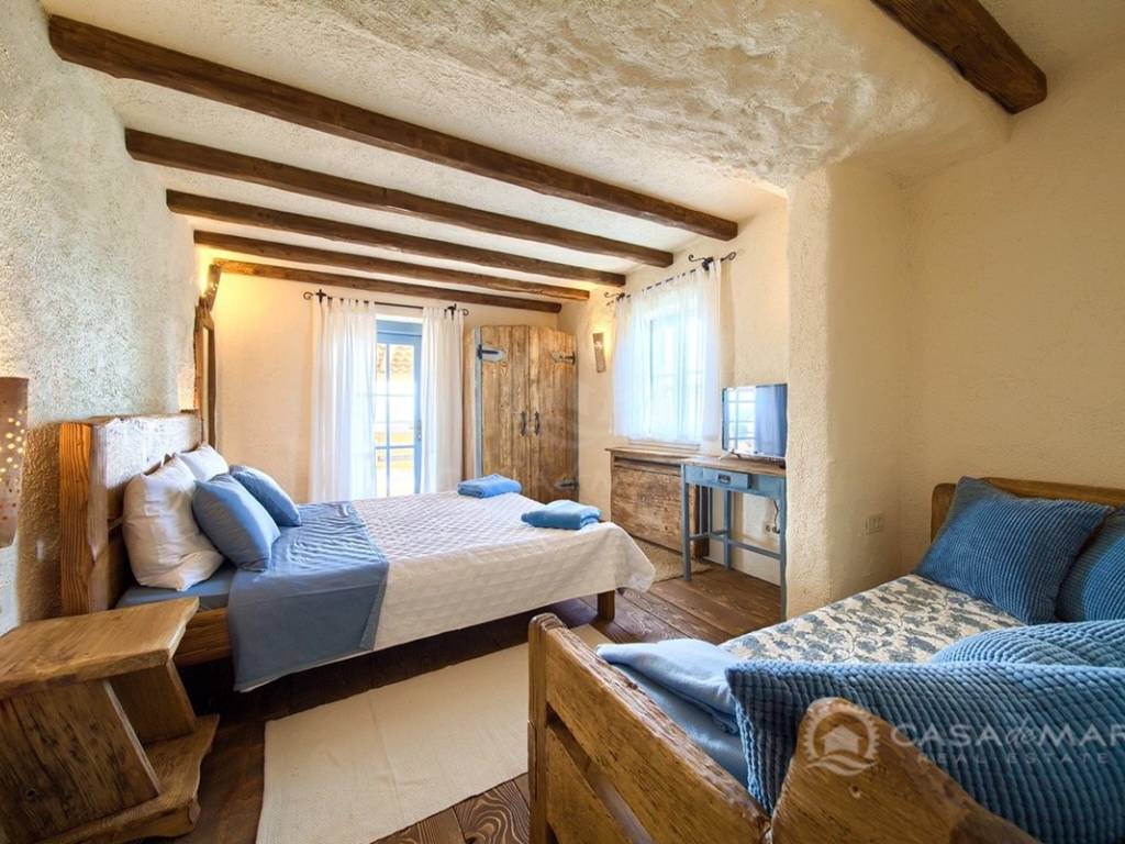On the first floor there are two bedrooms and a bathroom. Each room has its own exit to the covered terrace, which offers a beautiful view of the sea.