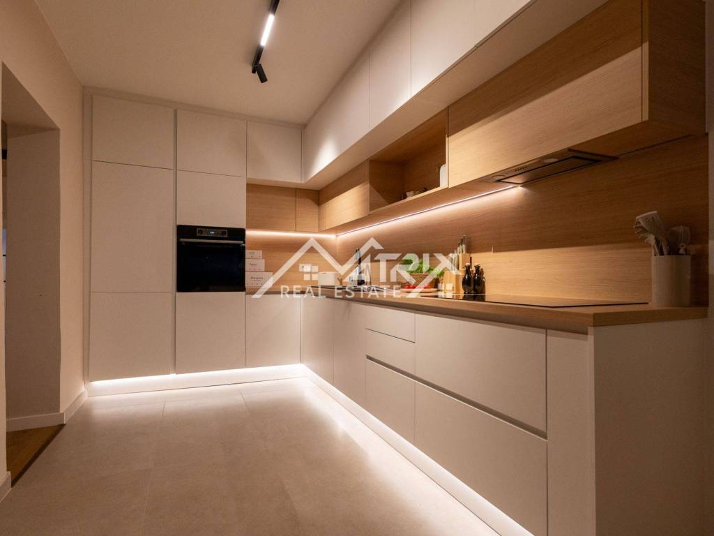 Electric underfloor heating is installed throughout the entire ground floor, along with Samsung Wind-Free air conditioning units. A large fireplace provides additional warmth and atmosphere. A new modern kitchen with built-in appliances has been installed, and the designer bathroom features built-in cabinets and Ideal Standard sanitary ware. Floors are covered with high-quality CLAP! 3D vinyl flooring, while exclusive tiles are used in the kitchen and bathroom.