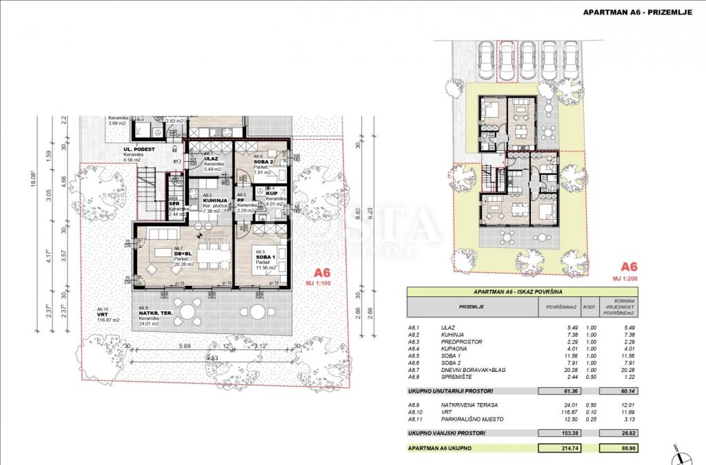 A two-bedroom apartment in a new building is for sale in Povljana on the island of Pag. The apartment with a living area of 61.36 m2 is located on the ground floor of a smaller residential building with 5 units. It consists of a living room, kitchen and dining room, two bedrooms and a bathroom, a storage room and a covered terrace of an additional 24 m2. The apartment also has a garden of 116.87 m2 and one private parking space in the courtyard of the building. The total usable area of the apartment together with the annexes is 214.74 m2 (K.V. 86.96 m2).